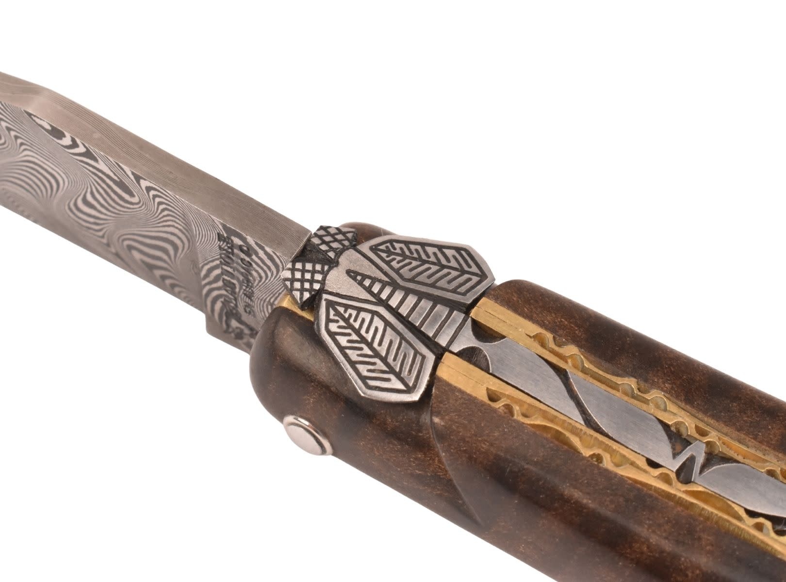 Dit uitzonderlijk Laguiole mes is vervaardigd uit loupe de laurel en heeft een mooi lemmet in damast balbach.
