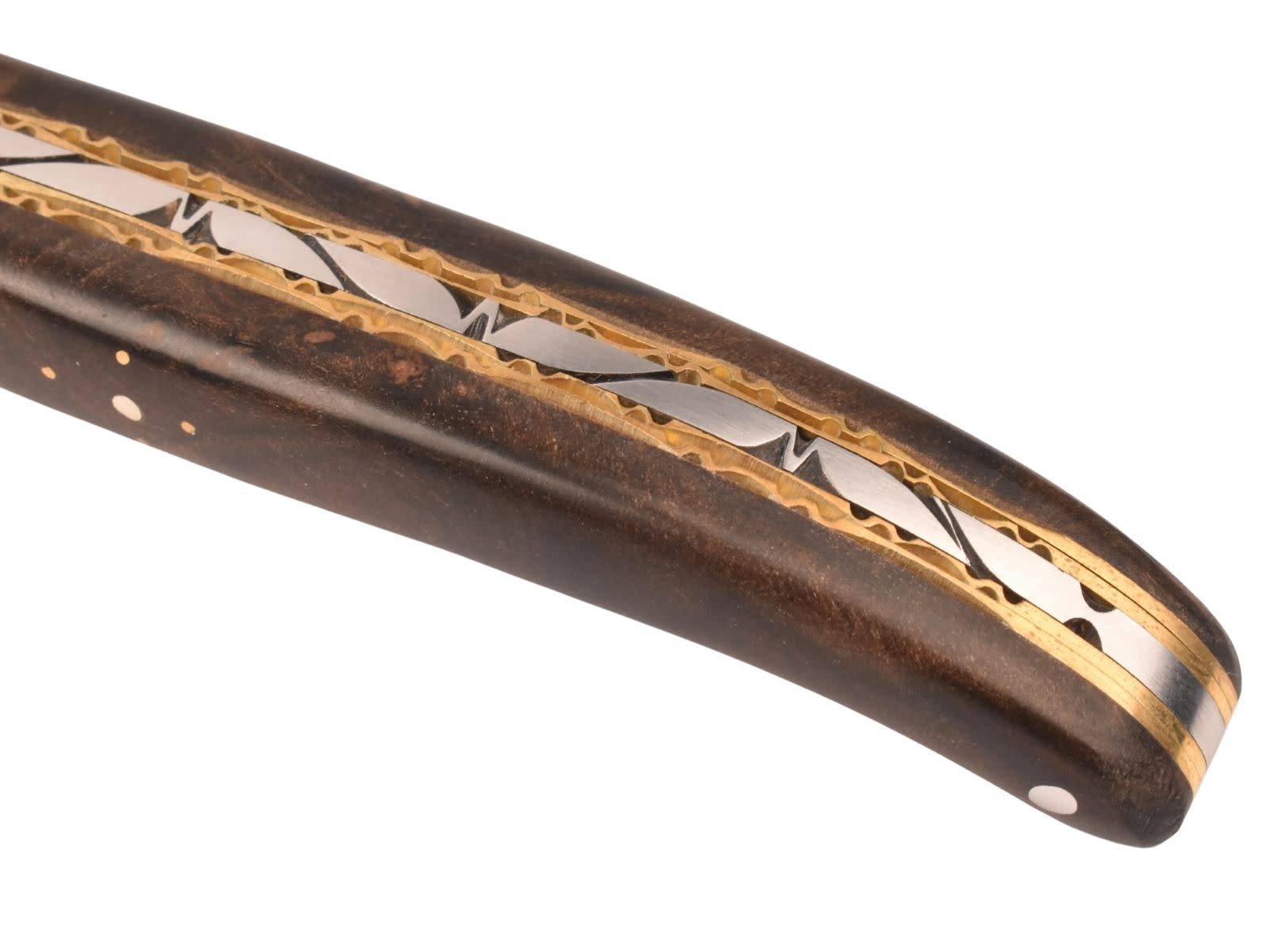 Laguiole en Aubrac mes van 12 cm met prachtig heft uit loupe de laurel, lemmet in damast balbach, messing plaatjes, double platines, zonder eindstukken en met mooi uitgewerkte Laguiole bij en rug.