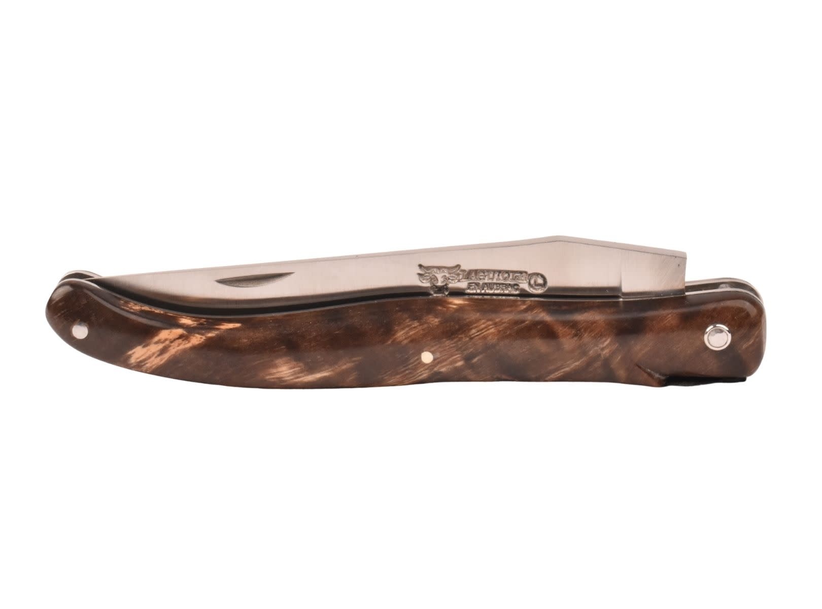Het Laguiole mes heeft geen eindstukken (plein manche) en een elegant rug met een vrolijk floraal patroon. De typische Laguiole bij is mooi symmetrisch uitgewerkt.