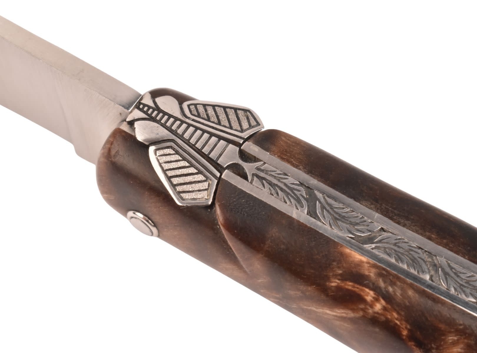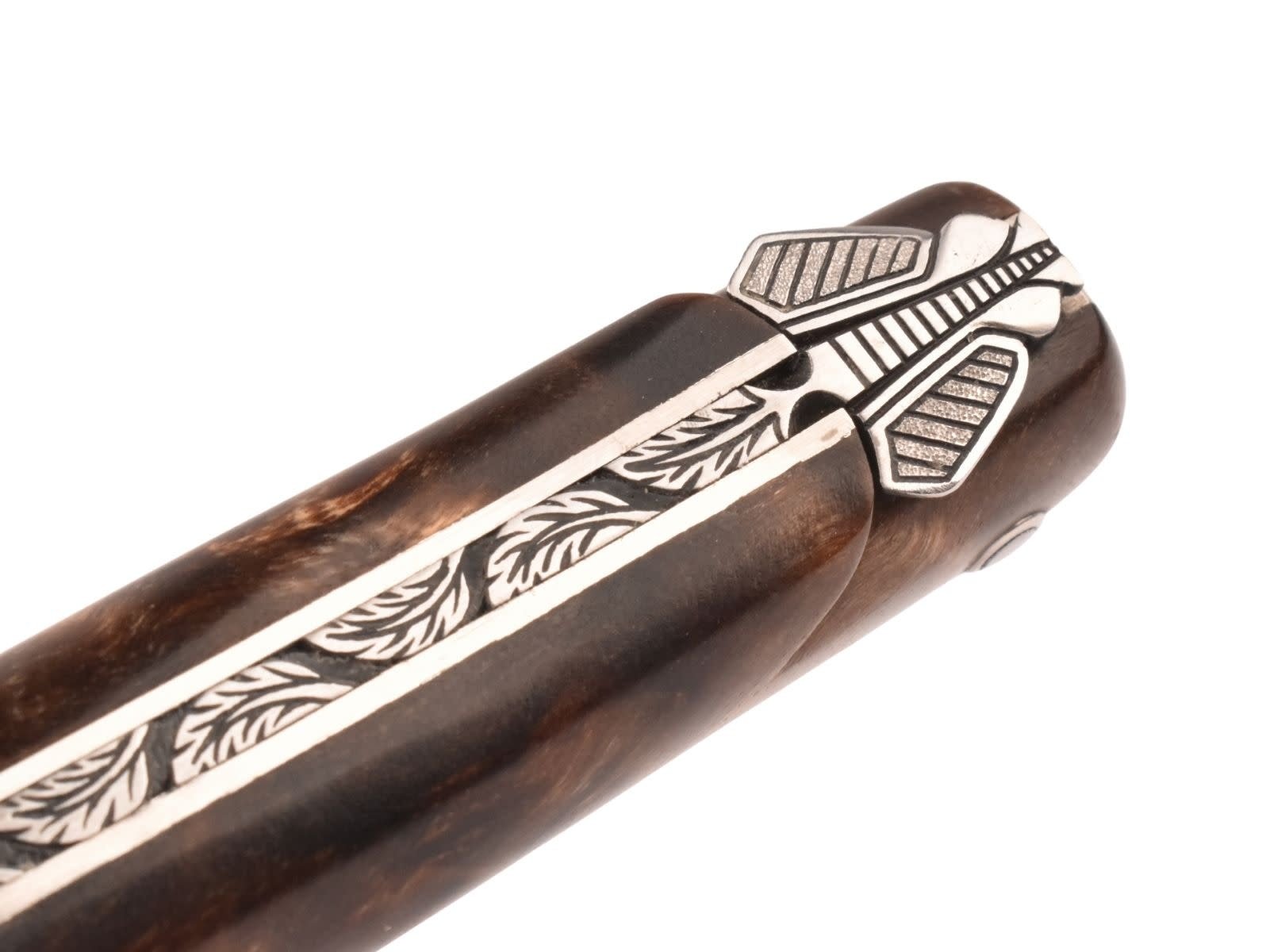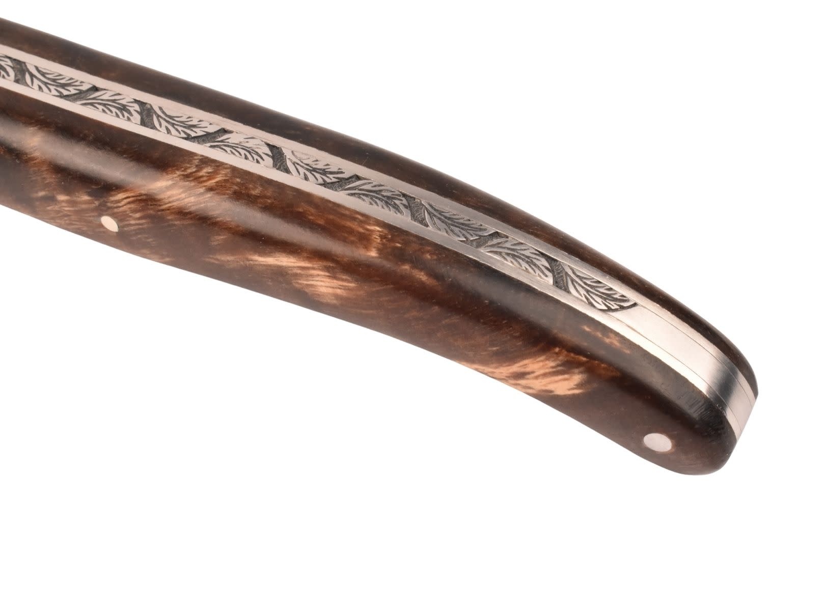 Laguiole en Aubrac mes van 12 cm met prachtig heft uit fourche de peuplier claire, platines guillochées, zonder eindstukken en met mooi uitgewerkte Laguiole bij en rug met floraal motief.