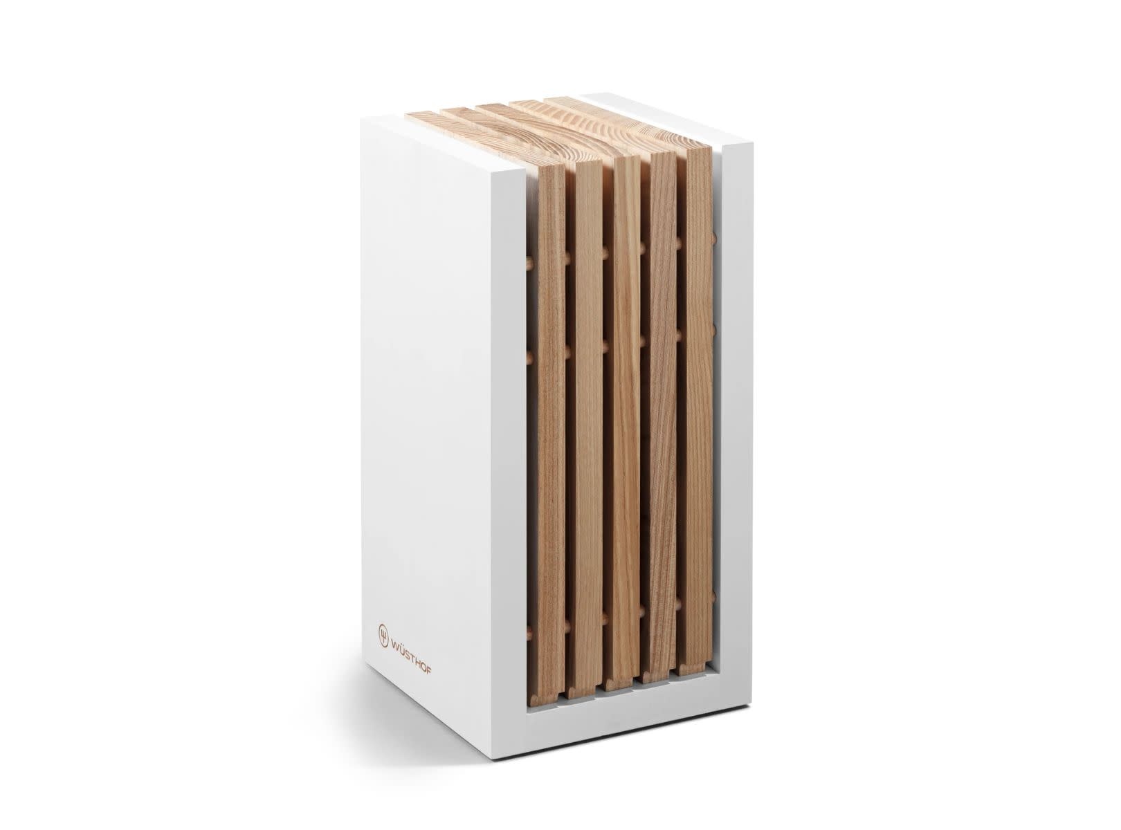 Het messenblok uit de Wüsthof Classic White serie heeft een minimalistisch design, waardoor deze prachtig staat in een moderne keuken. De combinatie van wit hout en geolied essenhout geeft het blok een naturel en fris uiterlijk.