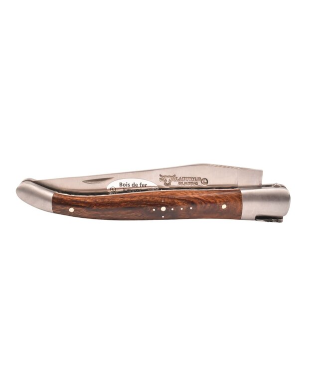 Een authentiek handgemaakt Frans Laguiole en Aubrac mes van 12 centimeter van hoge kwaliteit met een heft in prachtig bois de fer (ijzerhout), matte eindstukken, platines guillochées en typisch Laguiole bijtje.