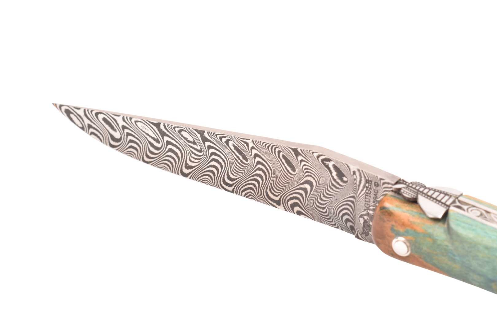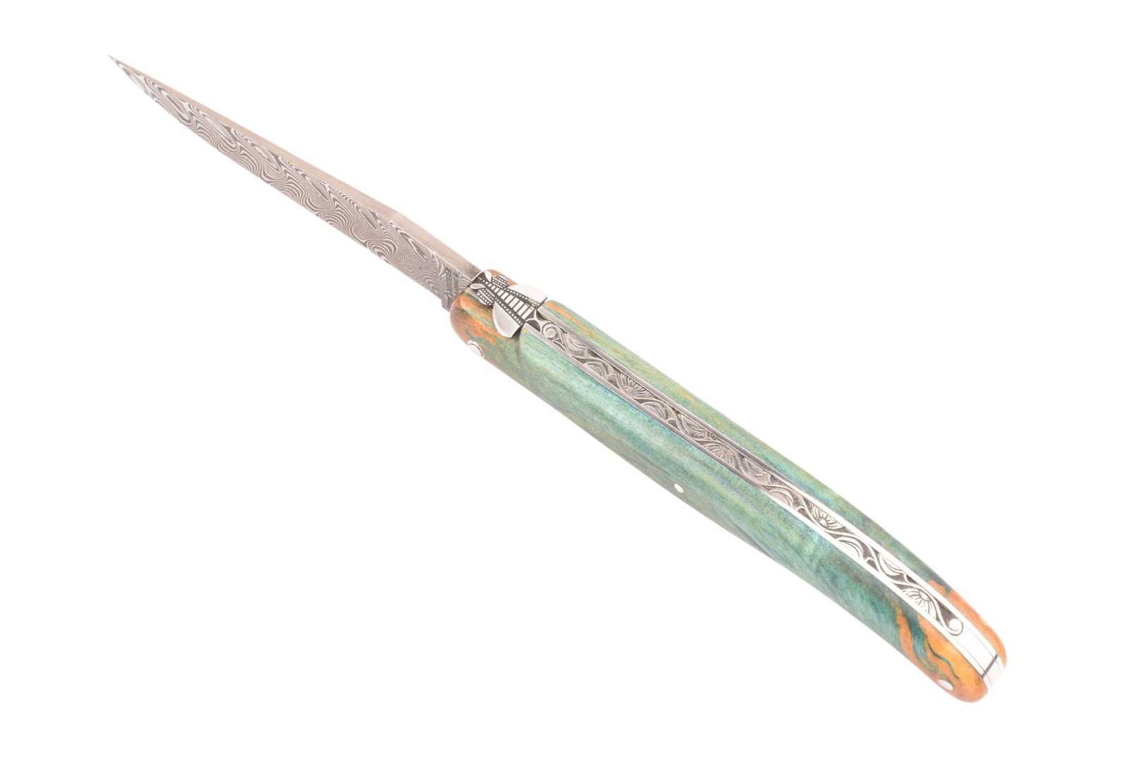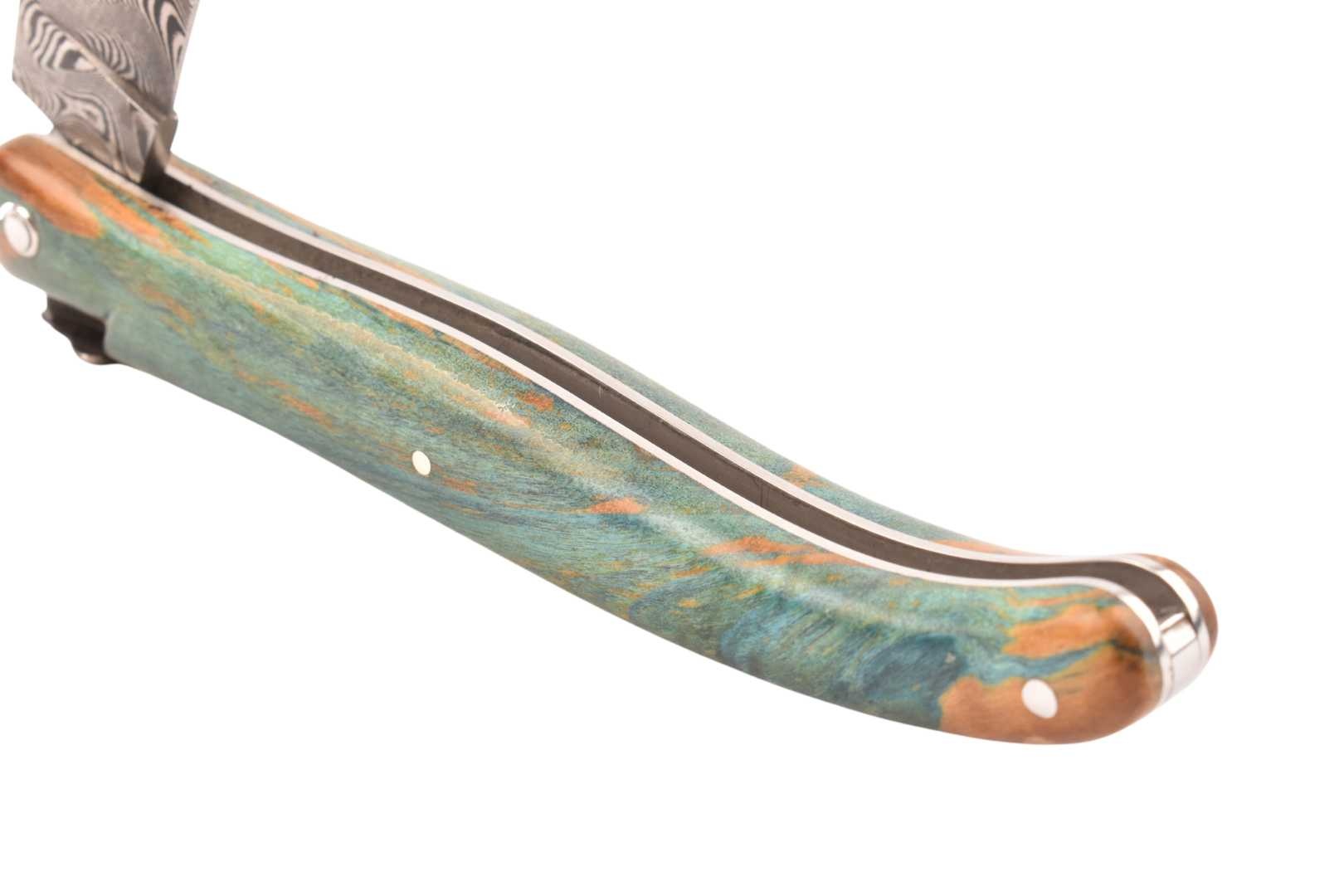 Dit Laguiole mes is vervaardigd uit loupe de marronnier en het lemmet is uit damast balbach, wat het mes een opvallend karakter geeft.