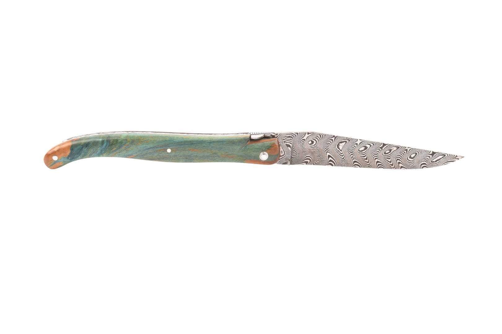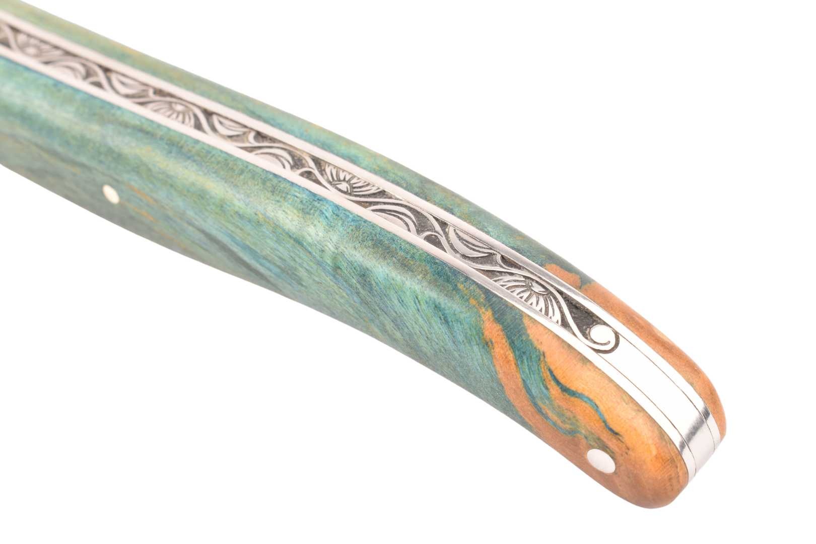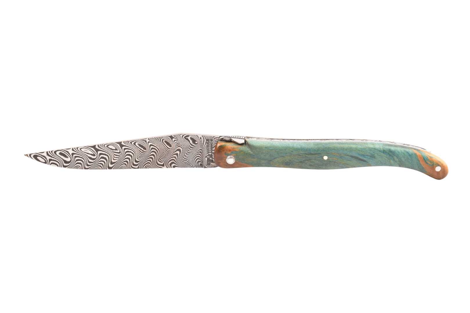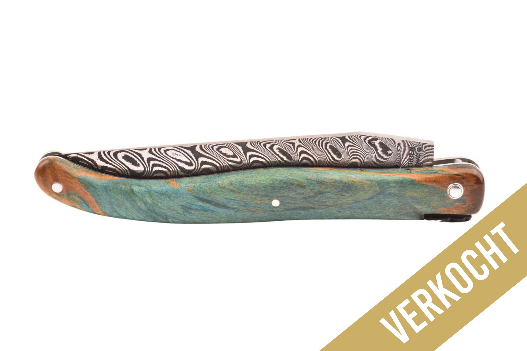 Dit Laguiole mes is vervaardigd uit loupe de marronnier en het lemmet is uit damast balbach, wat het mes een opvallend karakter geeft.