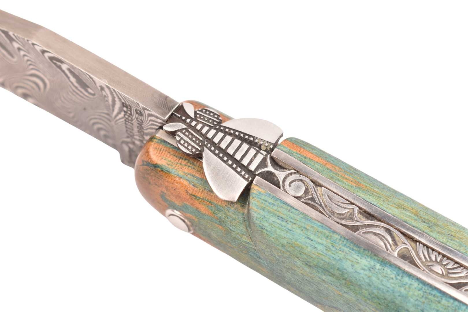Laguiole en Aubrac mes van 12 cm met prachtig heft uit loupe de marronnier, geen eindstukken, platines guillochées, lemmet uit damast balbach, fijn uitgewerkte rug met bladmotief en mooie Laguiole bij