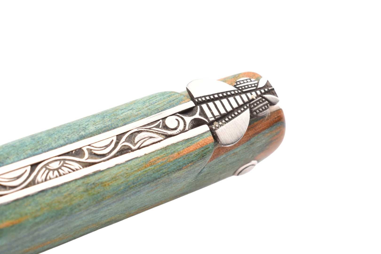 Het mes heeft geen eindstukken. Het vakmanschap van het graveren komt in dit mes sterk tot uiting door de fijn uitgewerkte rug met bladmotief en mooie Laguiole bij.