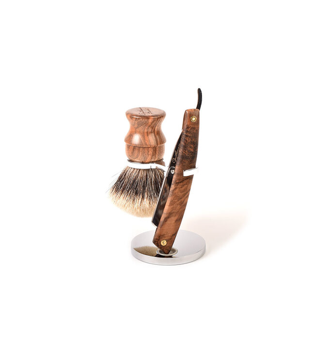 Scheerset met dassenharen scheerkwast en shavette in notenhout Lees meer.