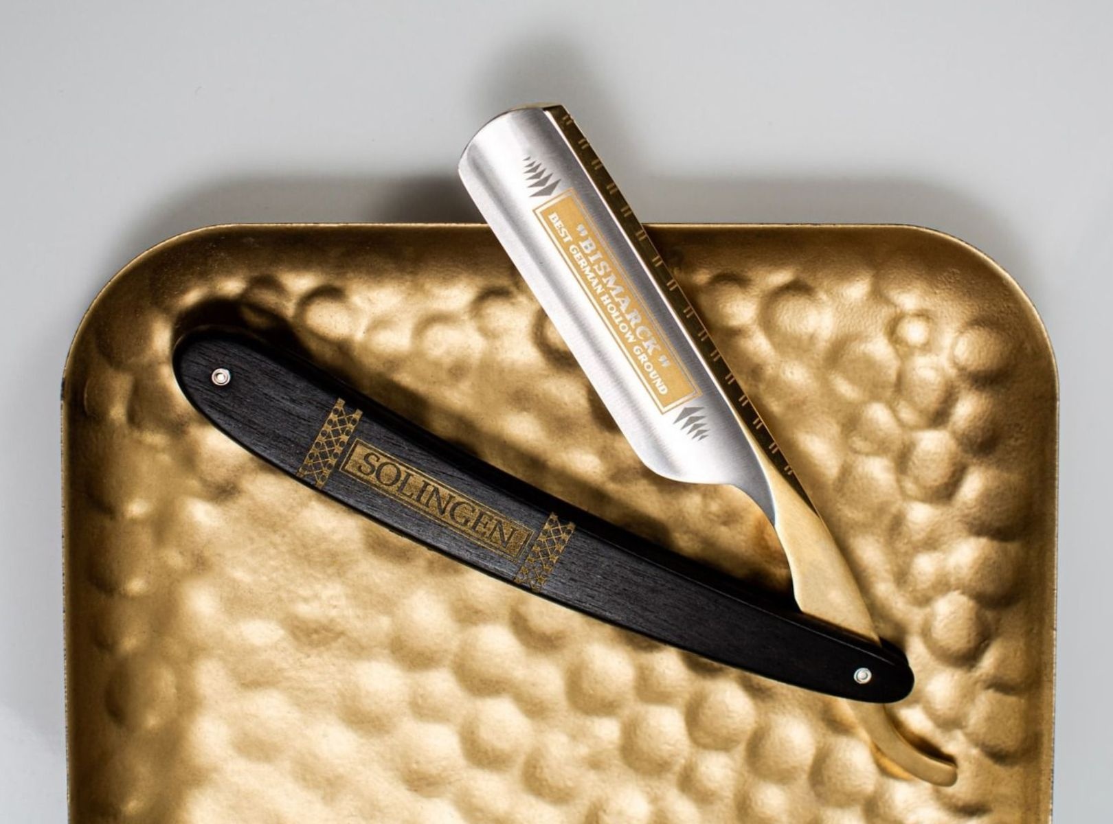 Dit open scheermes is gemaakt van koolstofstaal met materiaalnummer 1.2210, beter bekend als zilverstaal. Om een hardheid van circa 61 HRC te bereiken, wordt het materiaal verhit tot meer dan 1000 graden Celsius en vervolgens direct afgekoeld met een speciale olie. De daaropvolgende tempering bij circa 200 graden Celsius geeft het mesje elasticiteit en taaiheid. De ornamenten zijn prachtig verguld met 24-karaats goud.