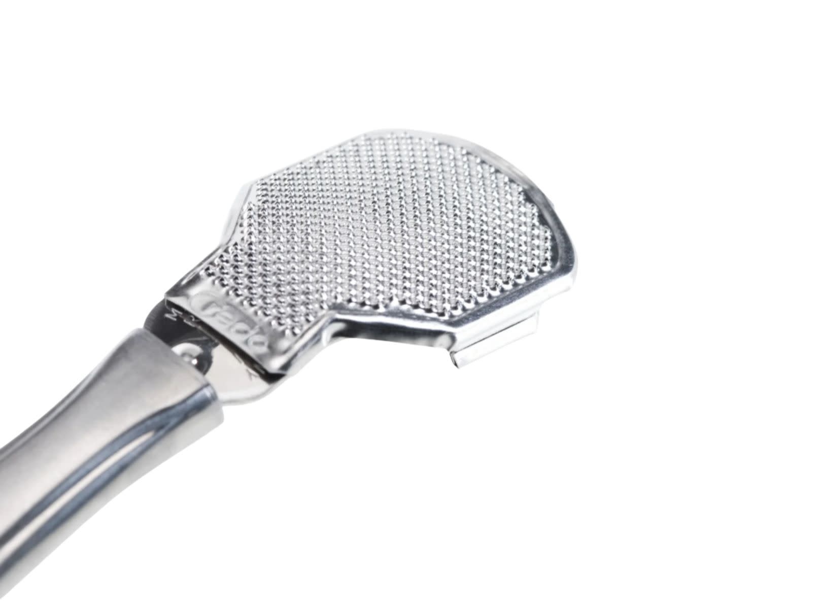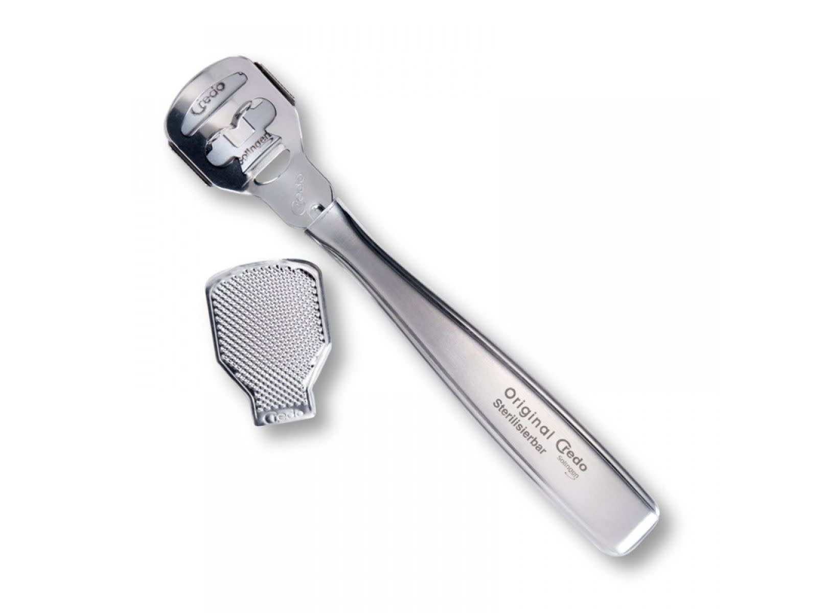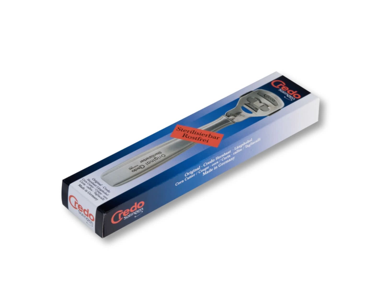 Dit Credo eeltmes in roestvrij staal is een onmisbaar instrument voor elke pedicure. Met deze eeltschaaf kunt u eenvoudig eelt verwijderen. Dit eeltmes is professioneel gereedschap voor het nauwkeurig en hygiënisch verwijderen van hardnekkige eeltplekken op de hiel, de bal van de voet en de tenen.