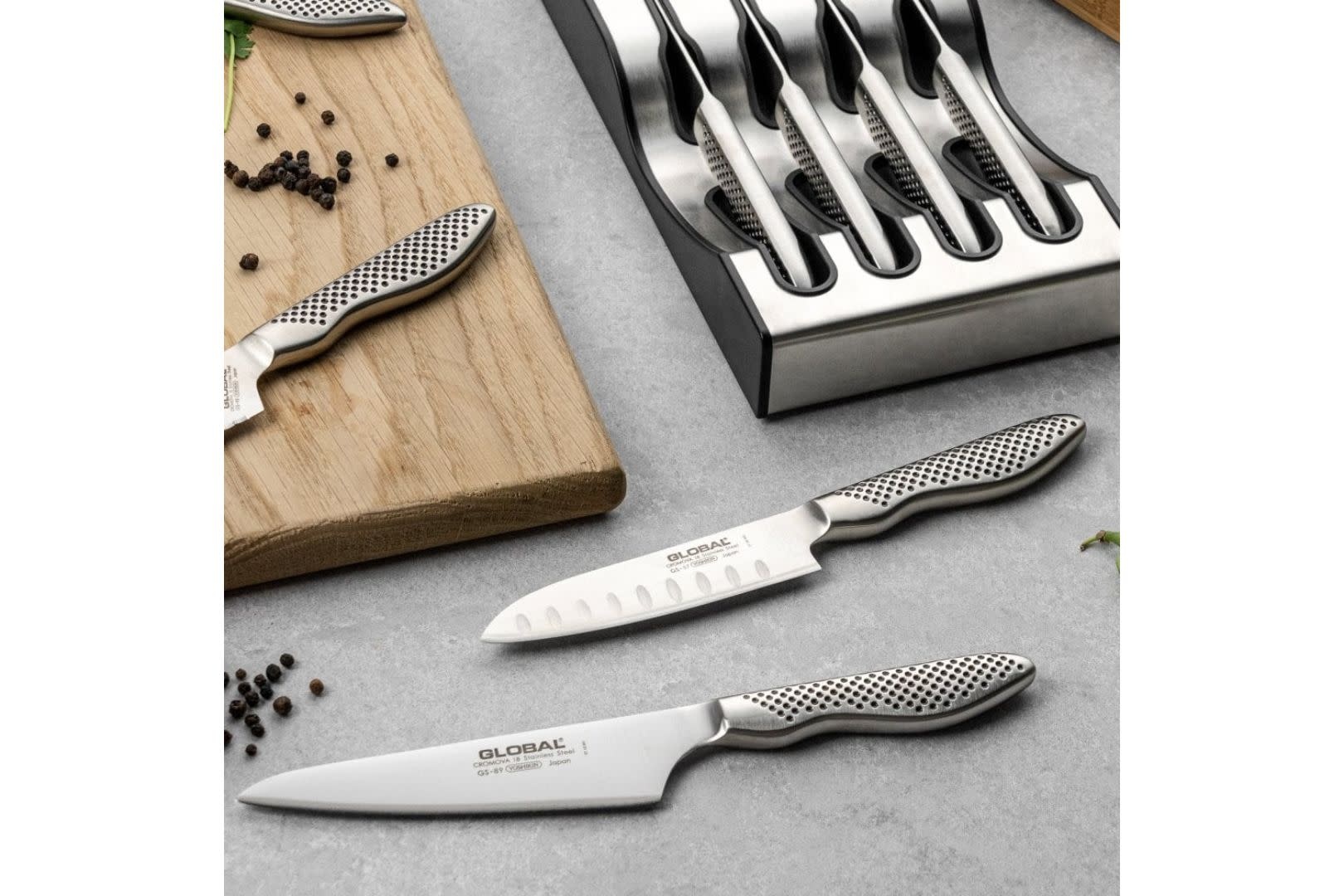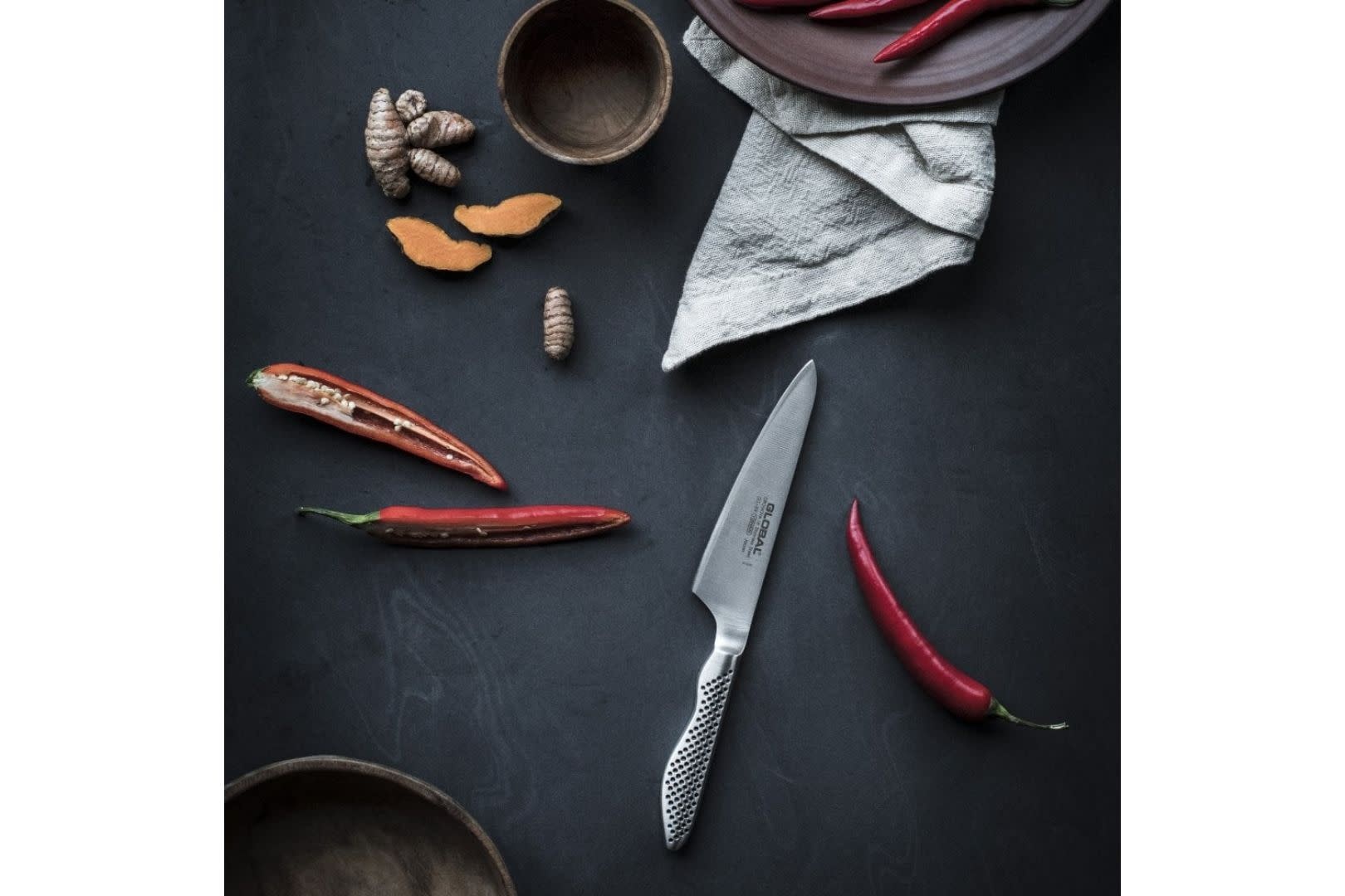 Dit Global GS-89 klein koksmes is een echte allessnijder. Het is net zoals zijn grotere broer de Global G2 een koksmes met een breed lemmet maar nu in mini formaat. Met zijn 13 cm lemmet ben je extra wendbaar en snijd je snel door grotere porties heen.