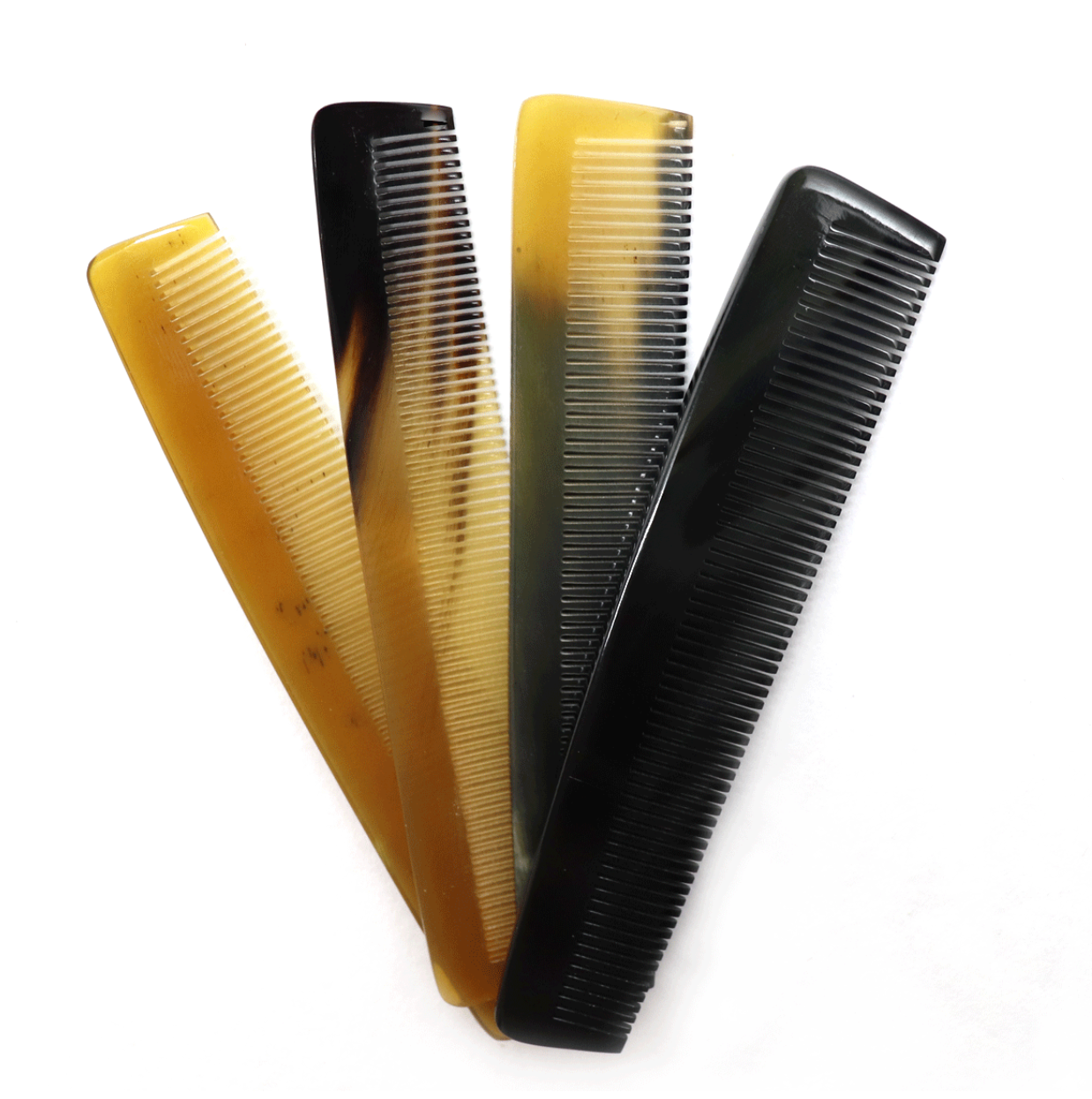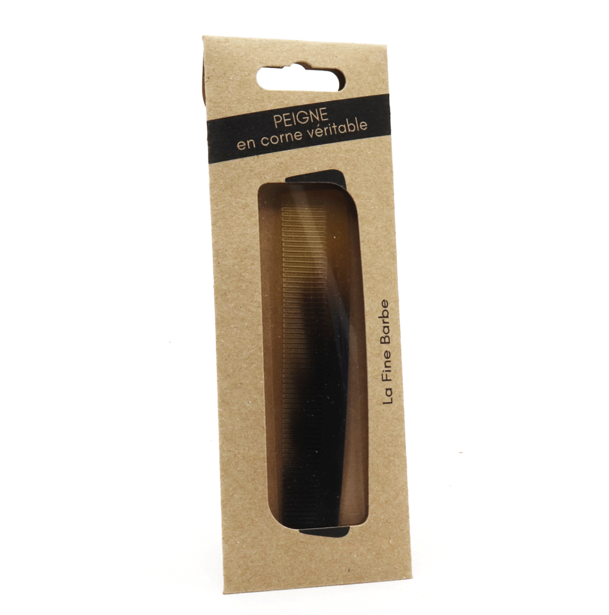 Klein hoornen kammetje met zeer fijne vertanding speciaal voor de verzorging van snorren of baarden. De tint en de tekening van het hoorn kan sterk verschillen per exemplaar. Een hoornen kam heeft als voordeel dat deze erg duurzaam is, gemaakt van natuurlijke materialen en dat een kam van hoorn in plaats van plastic, hout of staal niet statisch is.