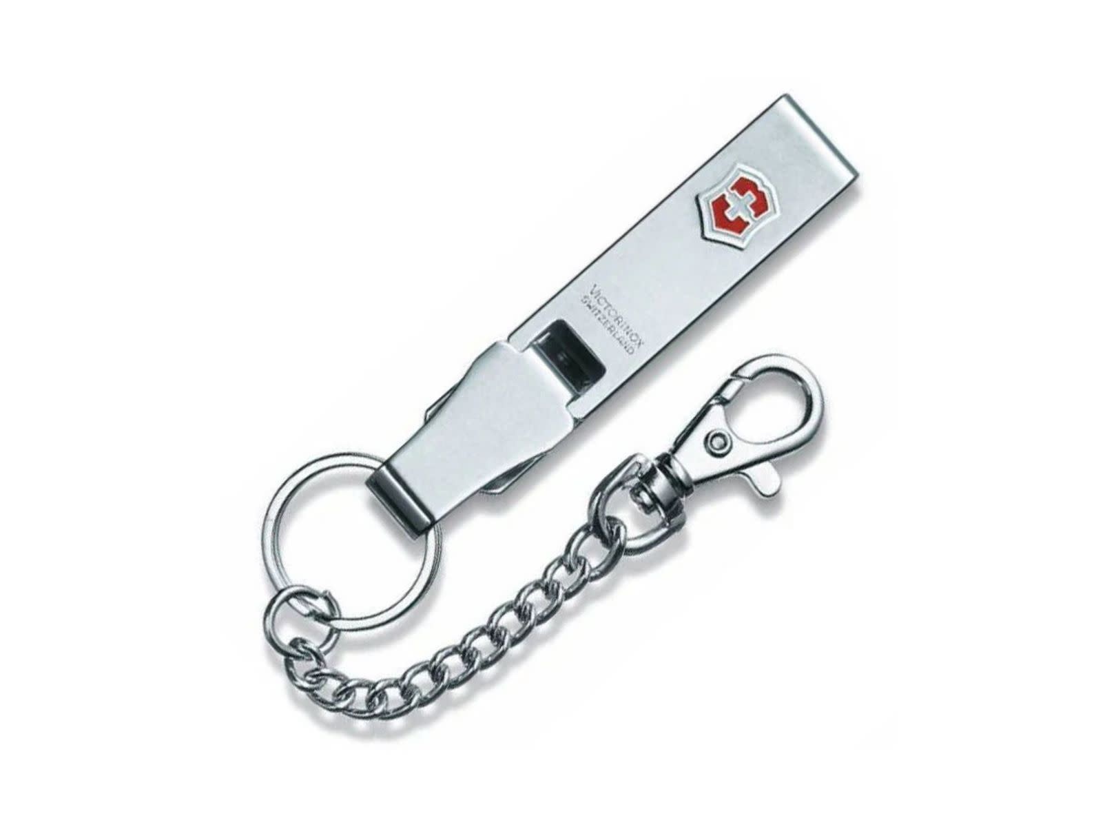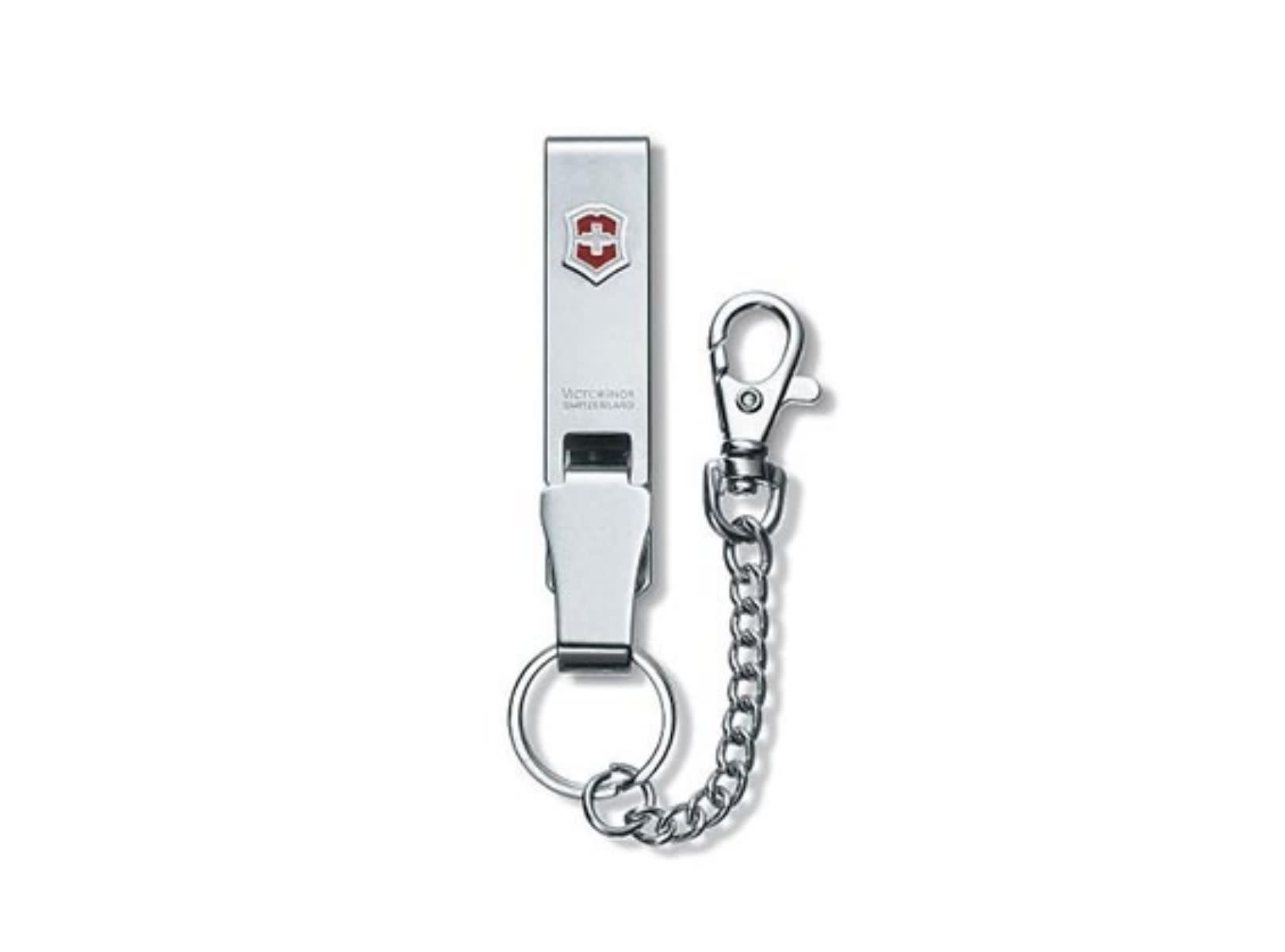 De Victorinox multi ketting clip is een handige riemclip met een korte ketting. Aan de ketting hang je een zakmes, zodat hij niet uit je broekzak kan vallen. De clip klemt zich goed rond je riem. Hierdoor kun je hem aan je riem klikken zodat je daarvoor je riem niet af hoeft te doen. De riemclip biedt plaats aan riemen tot 4,5 cm breed.