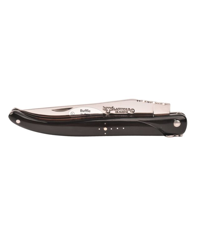 Een authentiek handgemaakt Frans Laguiole mes van hoge kwaliteit met heft in buffelhoorn, zonder eindstukken (plein manche) en met typisch Laguiole bijtje.