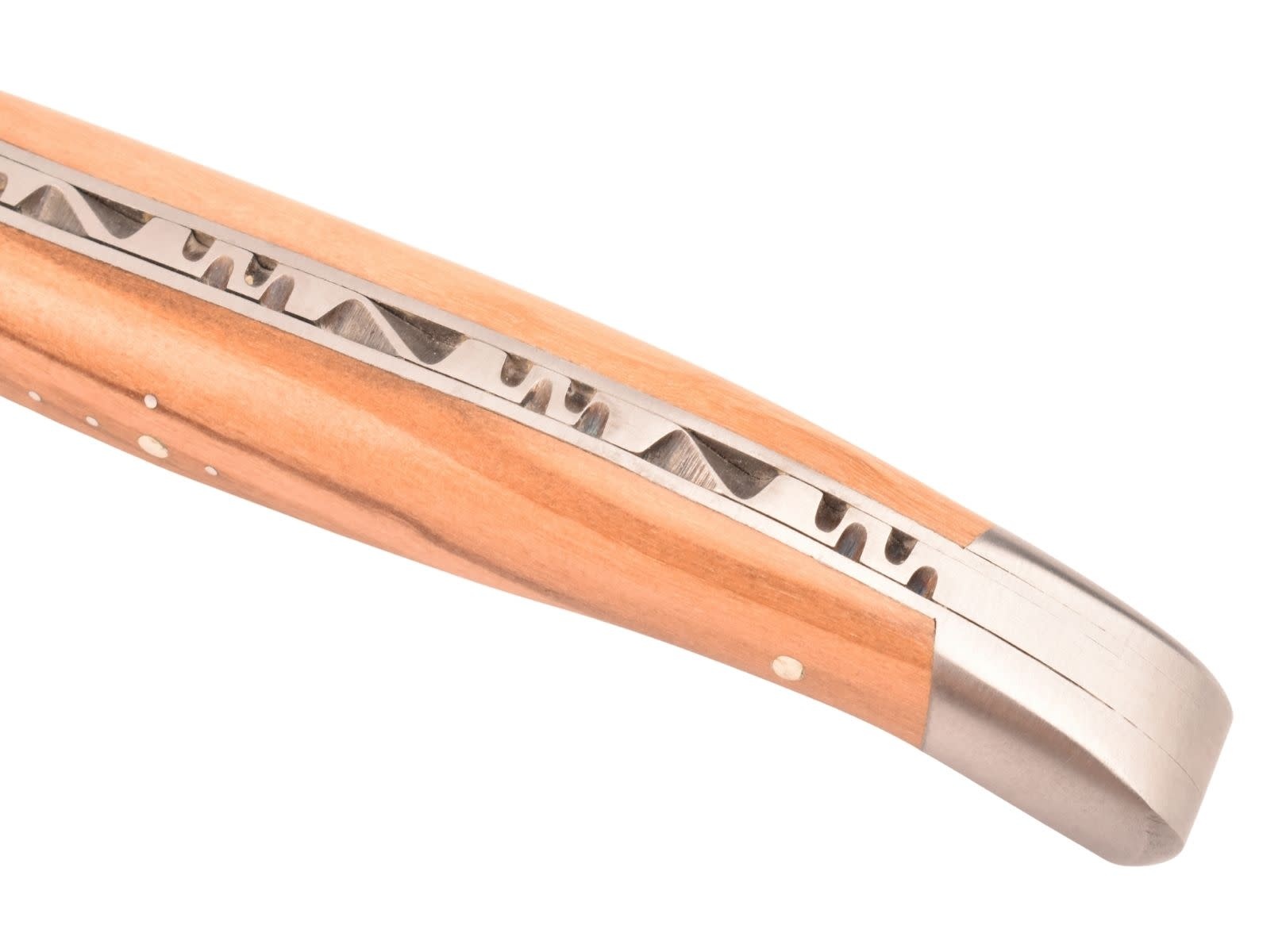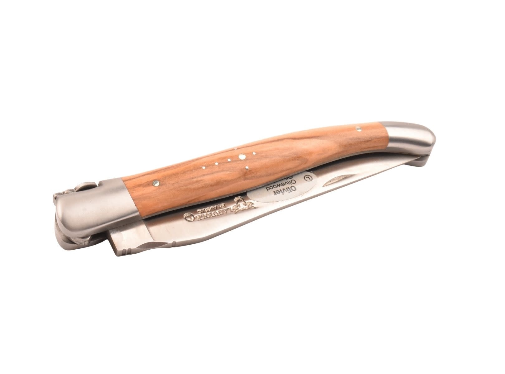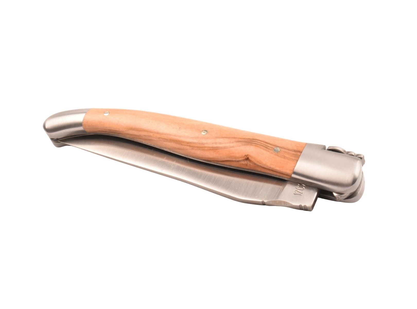 Een authentiek handgemaakt Frans Laguiole en Aubrac mes van hoge kwaliteit met heft in olijfhout met matte eindstukken. Ook het typisch Laguiole bijtje is uiteraard aanwezig.