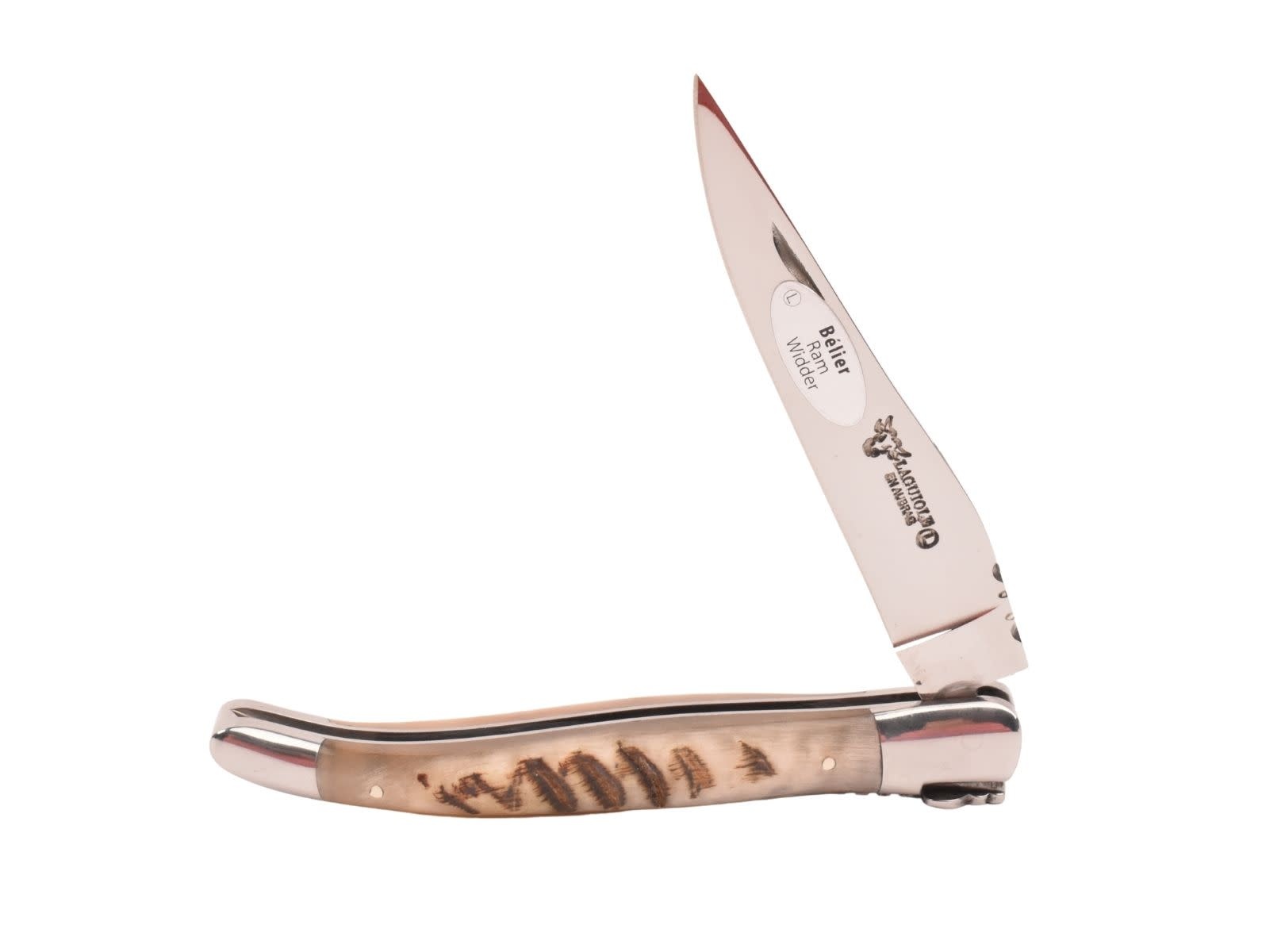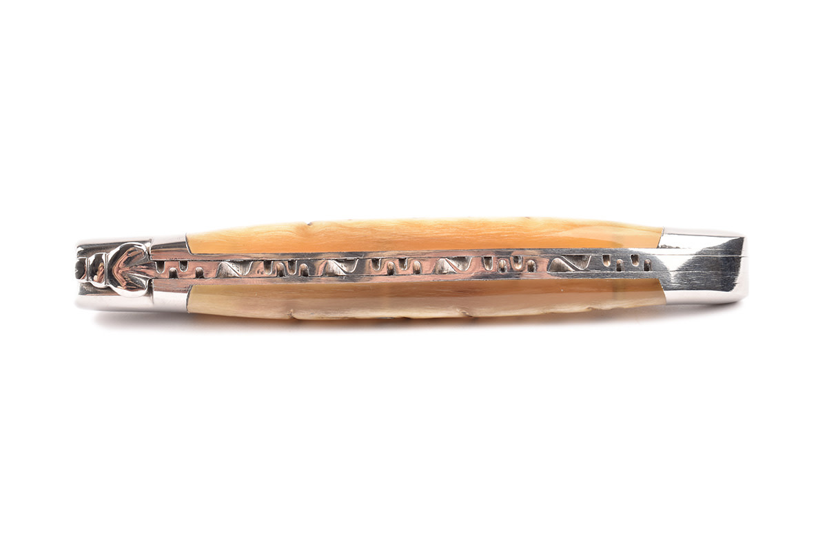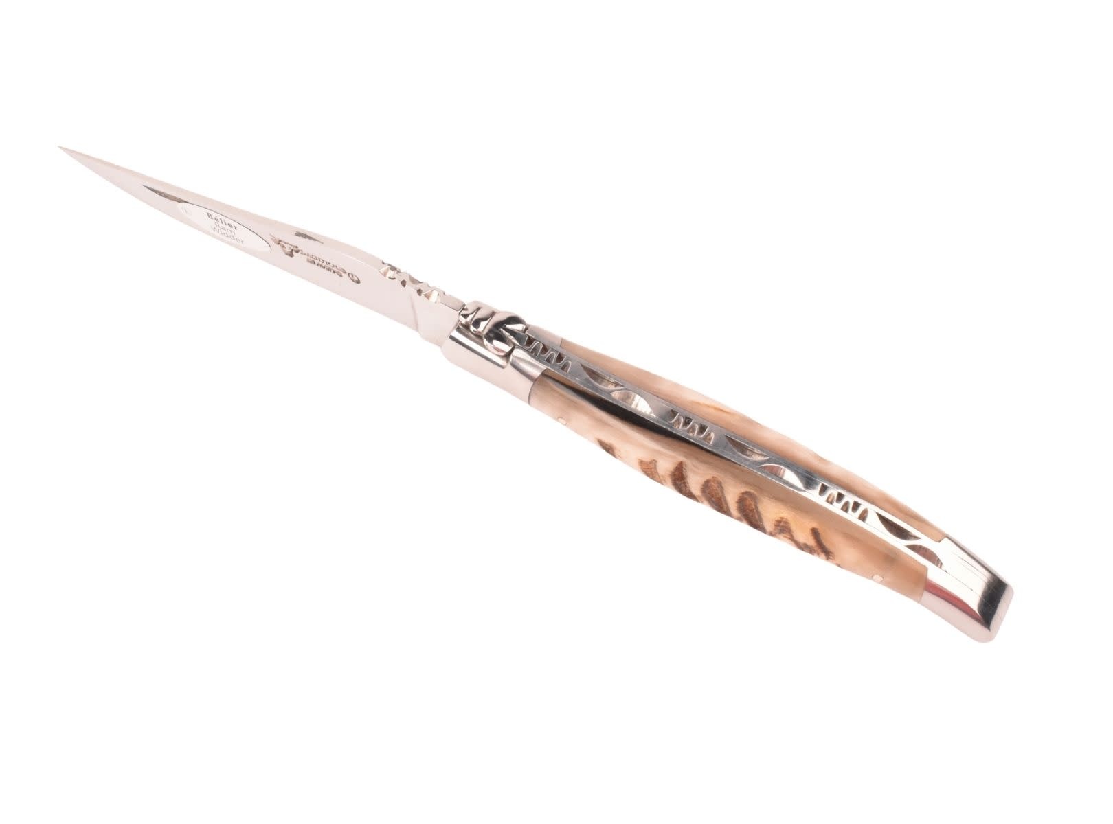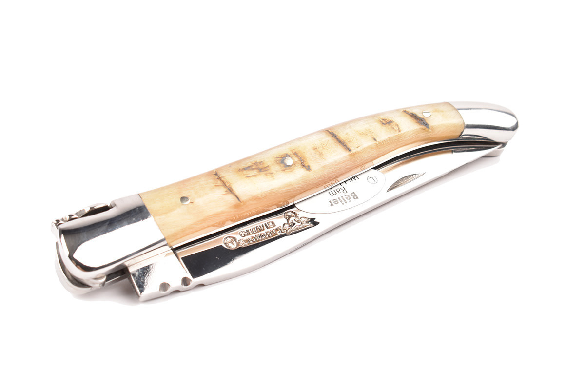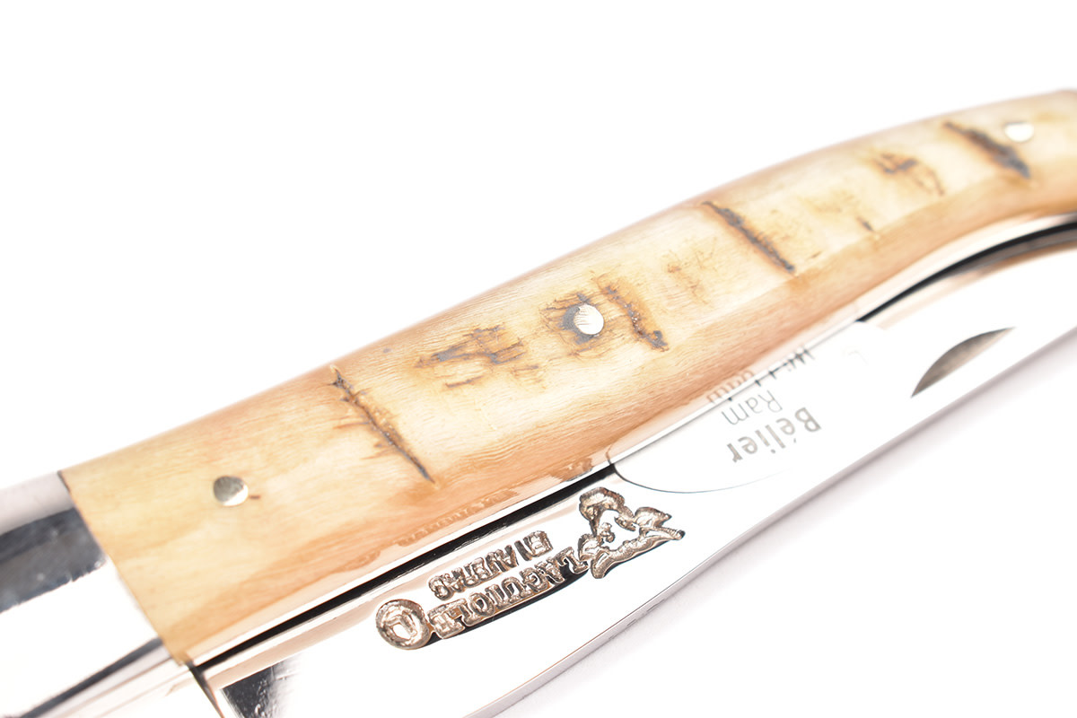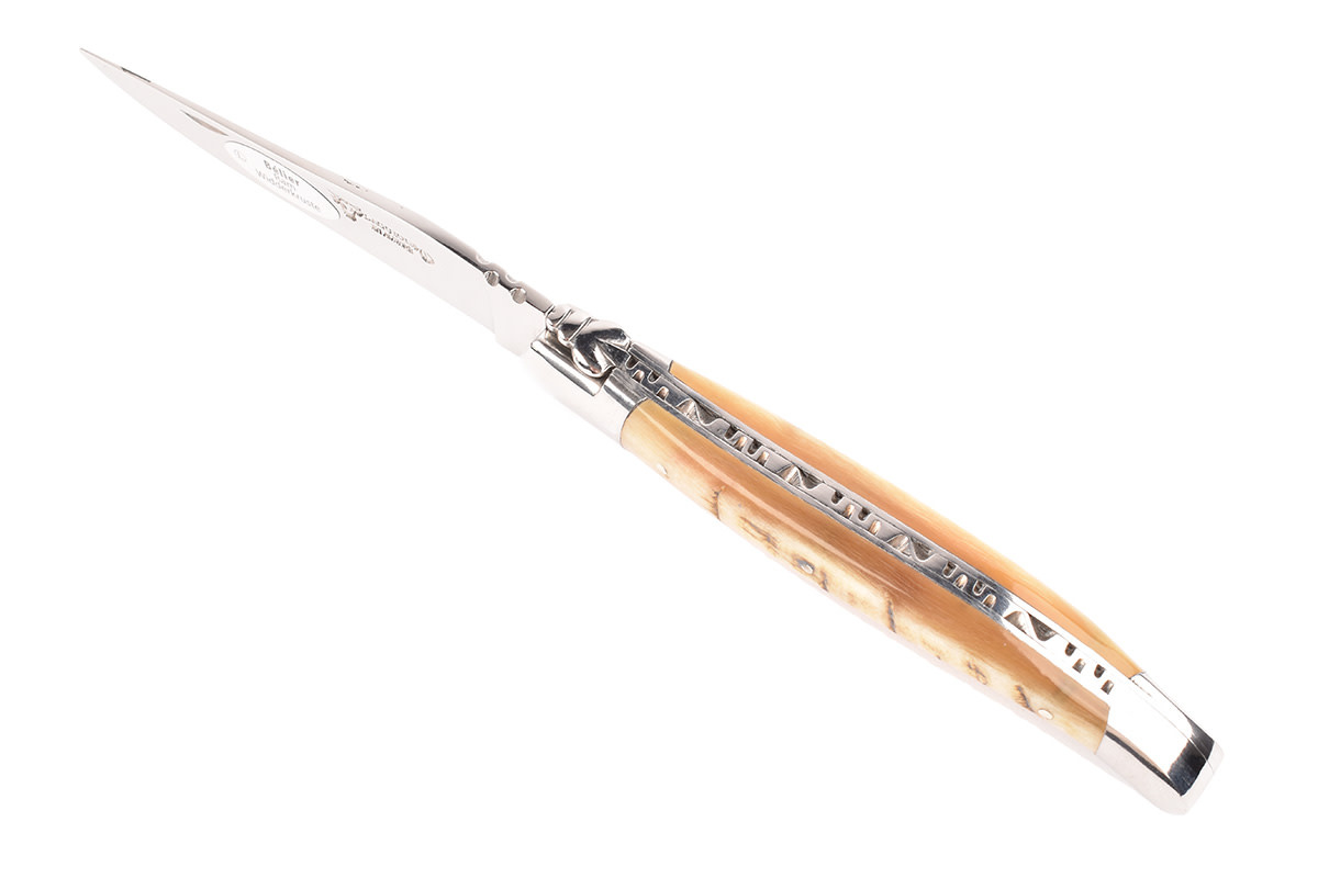 Een authentiek handgemaakt Frans Laguiole mes van hoge kwaliteit met heft in ramshoorn en glanzende eindstukken. Ook het typisch Laguiole bijtje is uiteraard aanwezig.