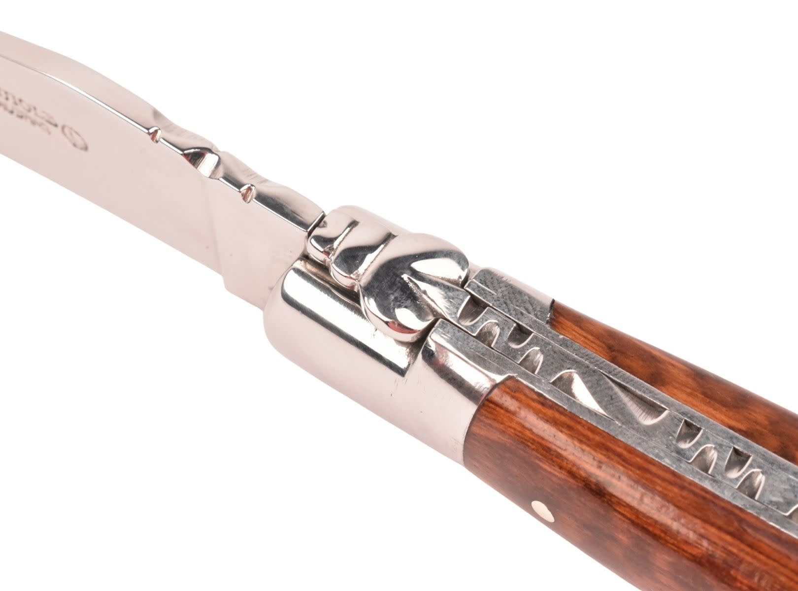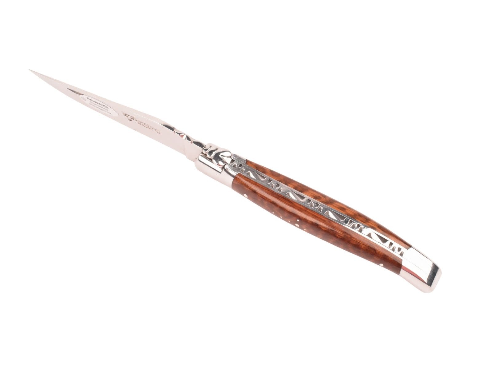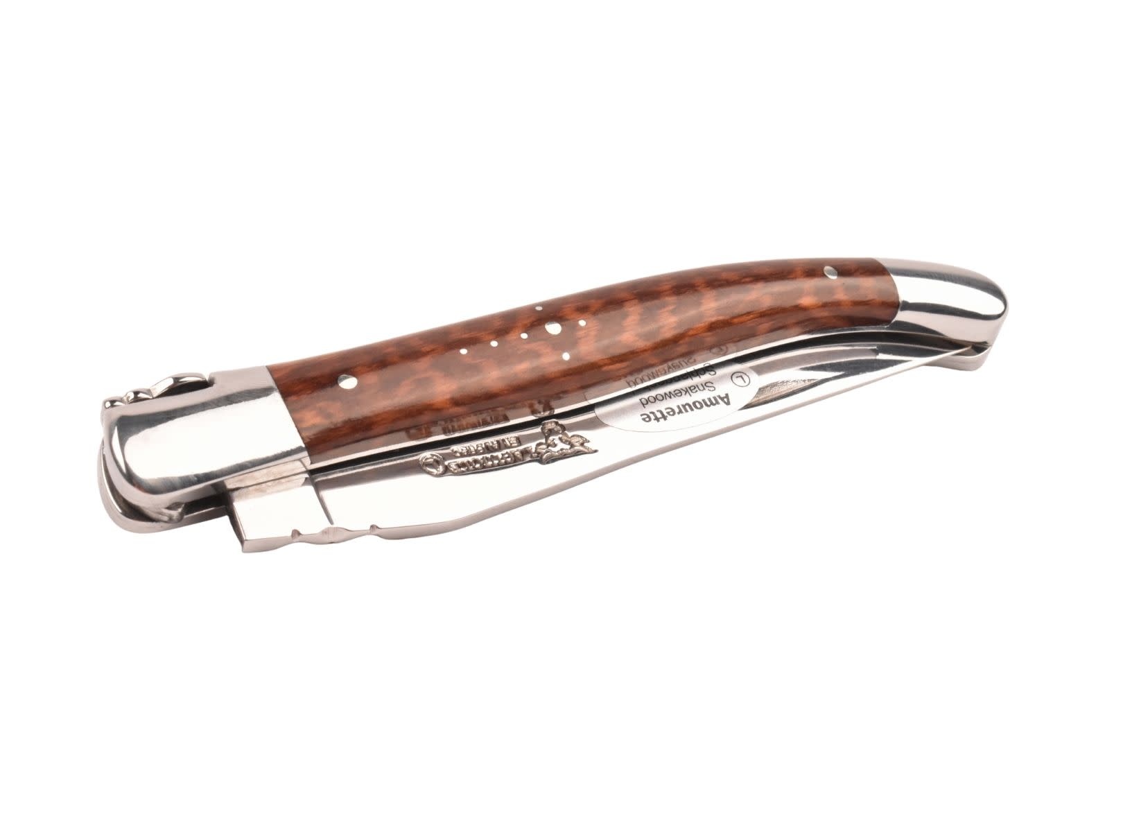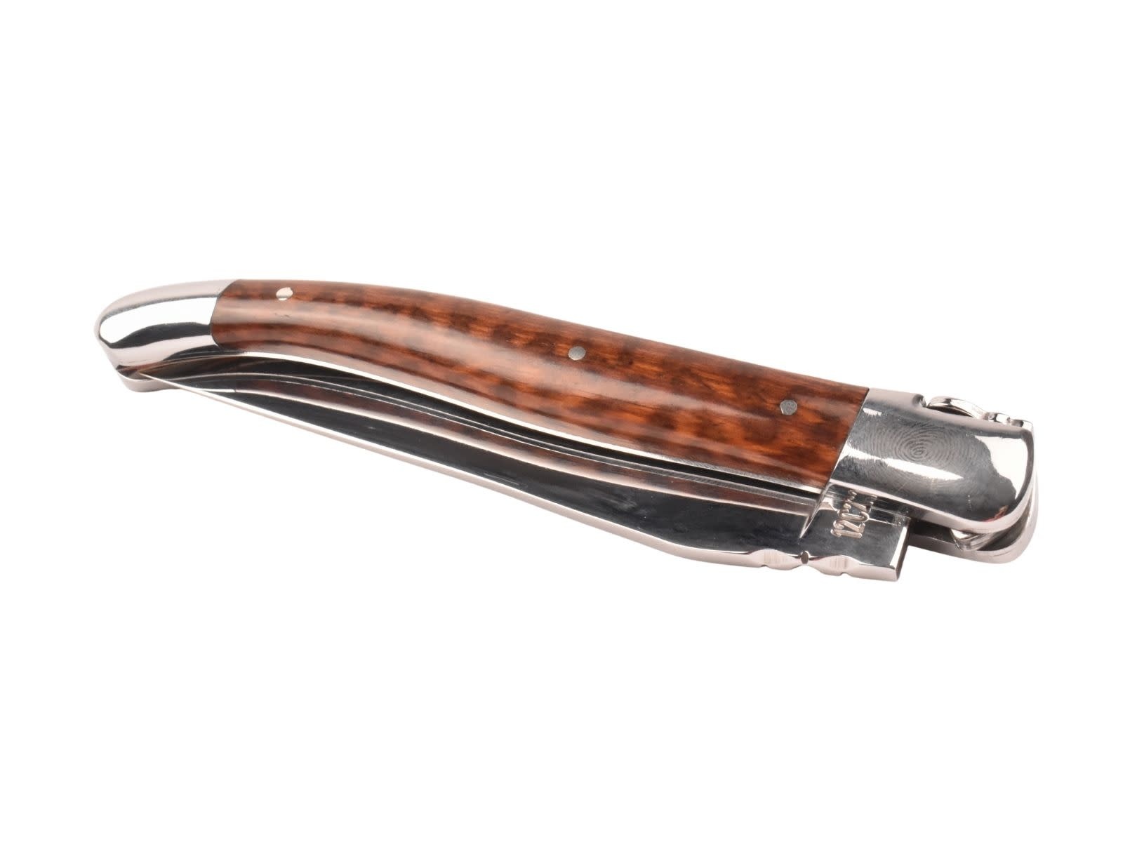 Een authentiek handgemaakt Frans Laguiole en Aubrac mes van hoge kwaliteit met heft in amourette met glanzende eindstukken. Ook het typisch Laguiole bijtje is uiteraard aanwezig.