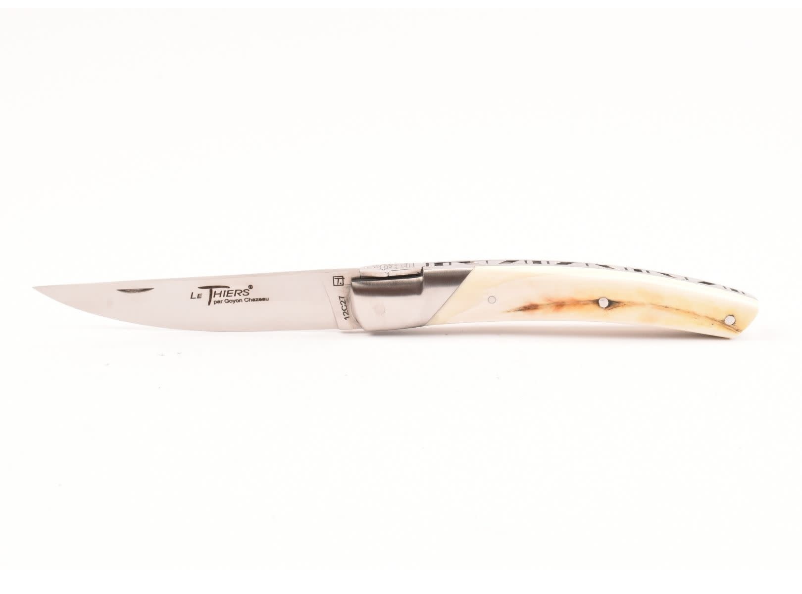 Het zakmes Le Thiers Pirou met een lemmet van 12 cm van Goyon-Chazeau zal liefhebbers van zakmessen bekoren. De bij is voorzien van het keurmerk "Château du Pirou". voorzien van het keurmerk "Château du Pirou". Het kasteel van Pirou dat op de gulp staat afgebeeld, is een knipoog naar het oudste gebouw van de stad Thiers en naar de 7 eeuwen die haar geschiedenis en bestekerfgoed hebben opgebouwd. Dit merk is een creatie en exclusiviteit van Goyon-Chazeau.