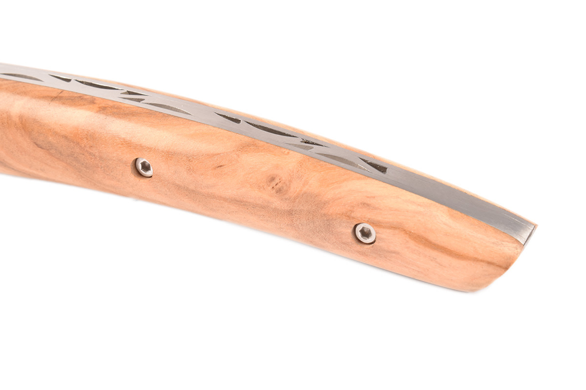 Het lemmet van dit Le Thiers mes is gemaakt van 12C27 roestvrij staal, bekend om zijn weerstand tegen corrosie en de uitzonderlijke duurzaamheid van al zijn snijkwaliteiten.