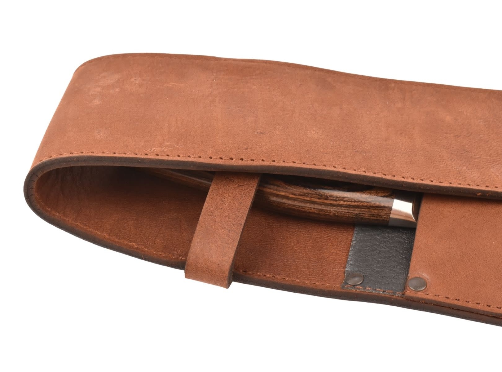 Het is vervaardigd uit biologisch gelooid paardenleer, waardoor elke schede uniek is met een vontage look. Het leer is zeer expressief en de lange levensduur van het dier wordt weerspiegeld in elke huid. Het is gelooid met olijfbladextracten, heeft een flatterende feel en is afgewerkt met was. Voor extra bescherming is het leer aan beide zijden versterkt met Kevlar.