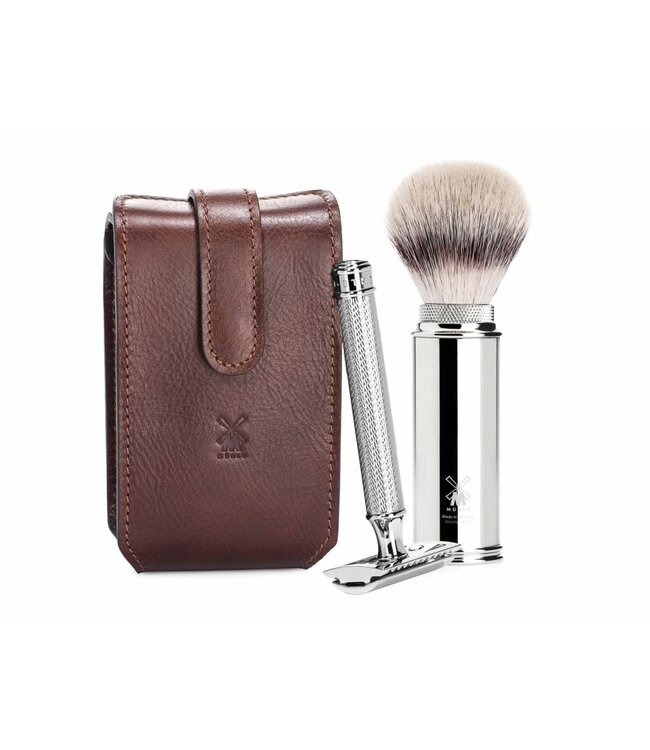 Mühle reisscheerset met safety razor R89, lederen reis-etui en silvertip fibre reisscheerkwast.