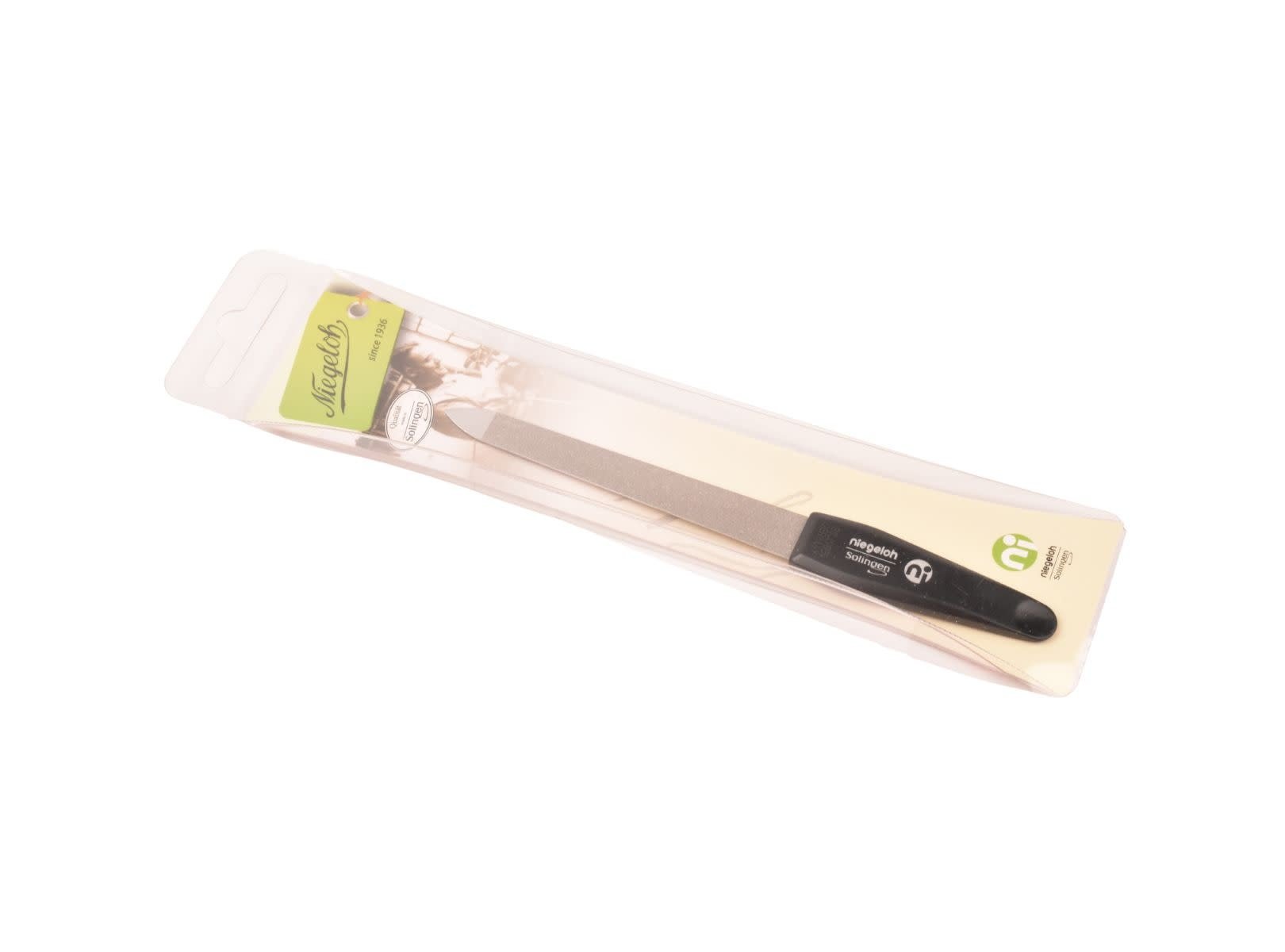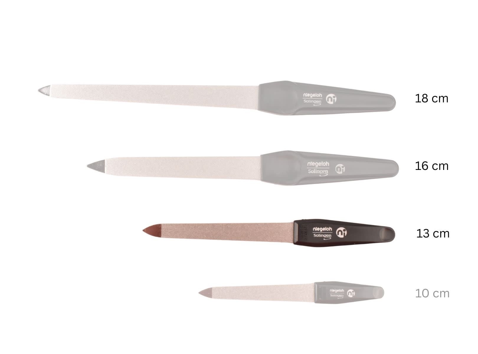 Niegeloh dubbelzijdige nagelvijl 13 cm, met grove en fijne coating. Gebruik de grove kant voor het voorzichtig vormgeven van nagels, gebruik de fijne kant voor het gladmaken van nagelranden.