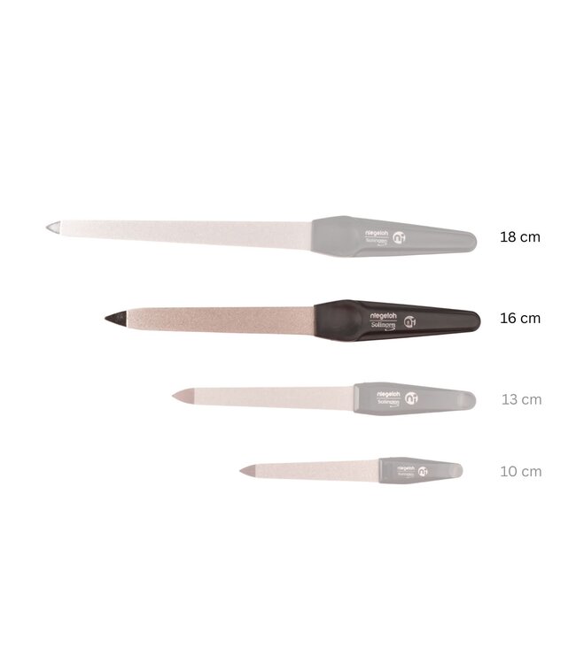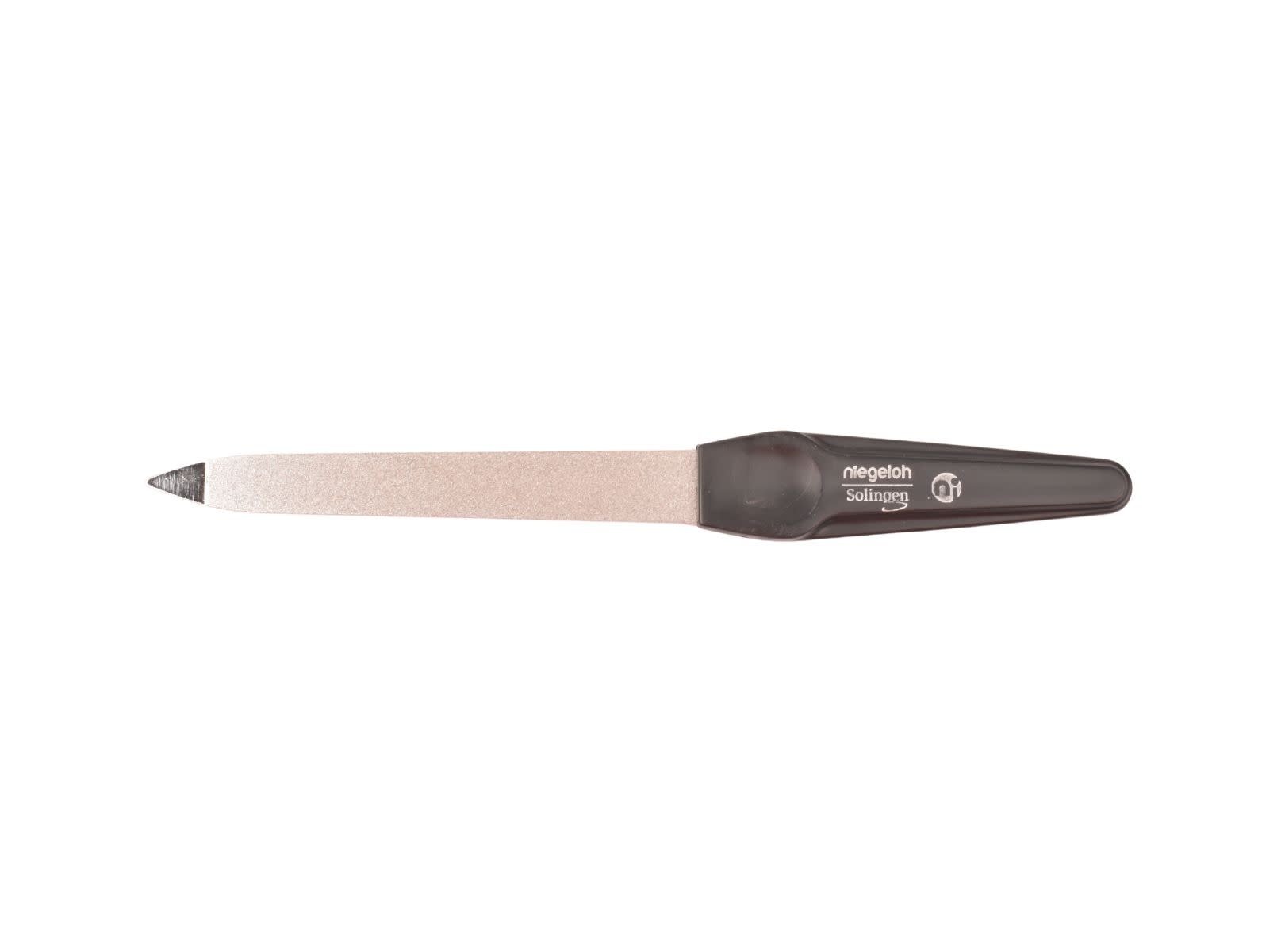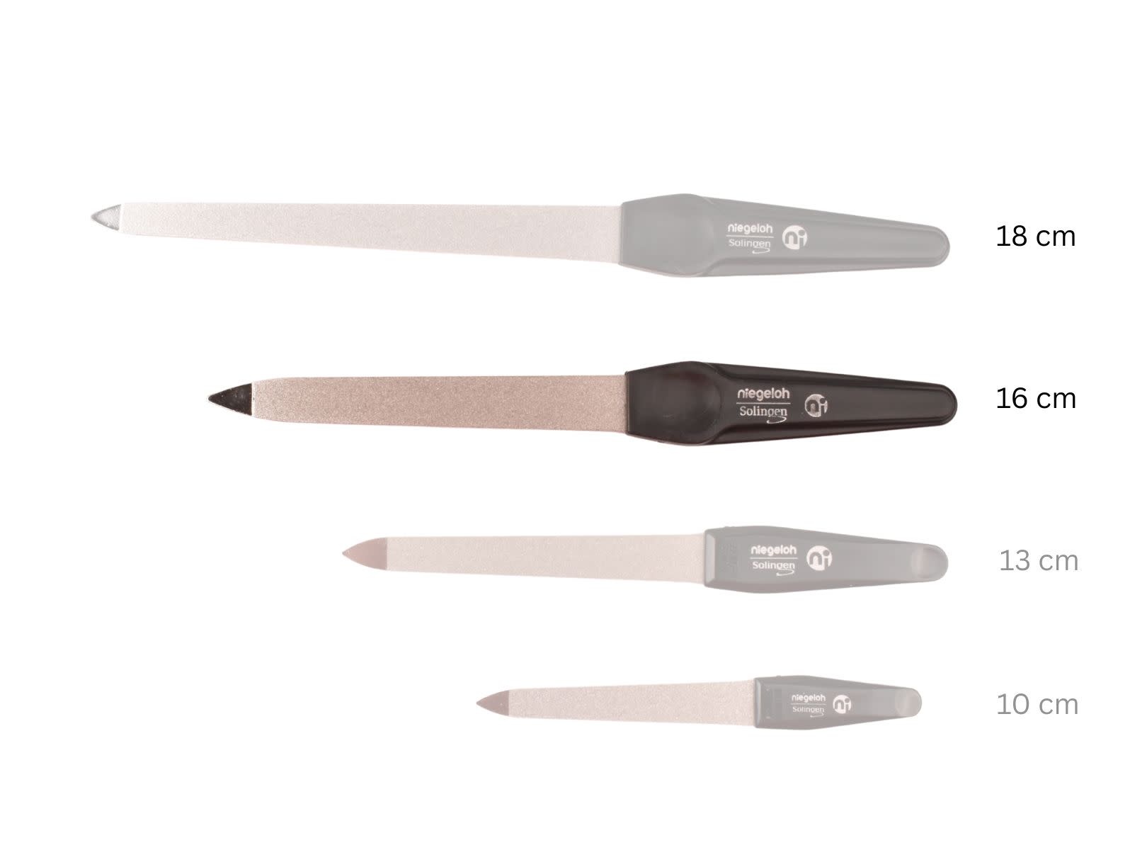 Niegeloh dubbelzijdige nagelvijl 16 cm, met grove en fijne coating. Gebruik de grove kant voor het voorzichtig vormgeven van nagels, gebruik de fijne kant voor het gladmaken van nagelranden.