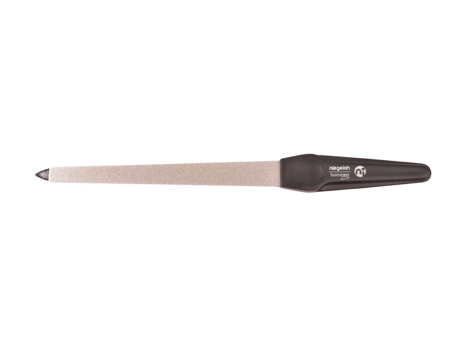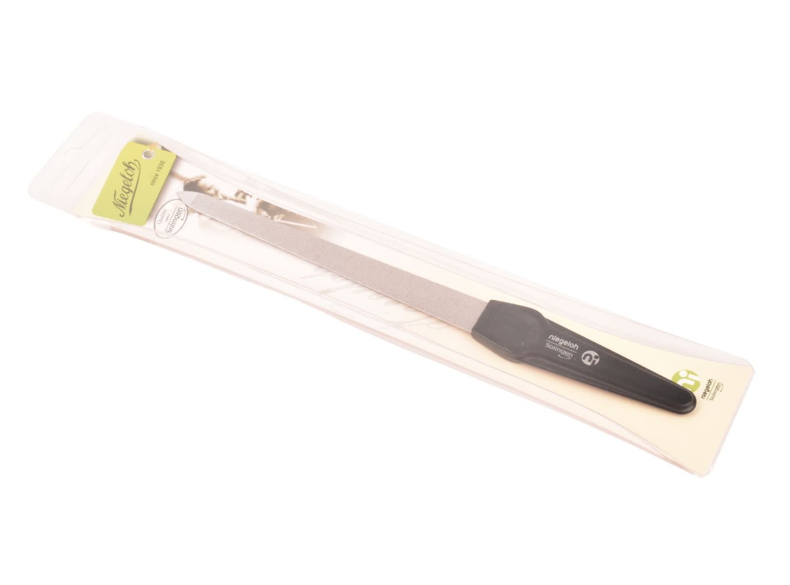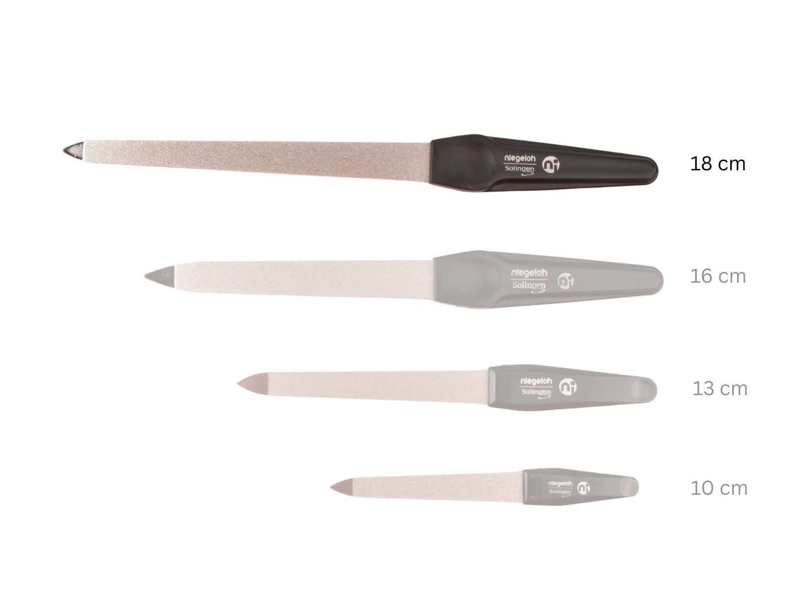 Niegeloh dubbelzijdige nagelvijl 18 cm, met grove en fijne coating. Gebruik de grove kant voor het voorzichtig vormgeven van nagels, gebruik de fijne kant voor het gladmaken van nagelranden.