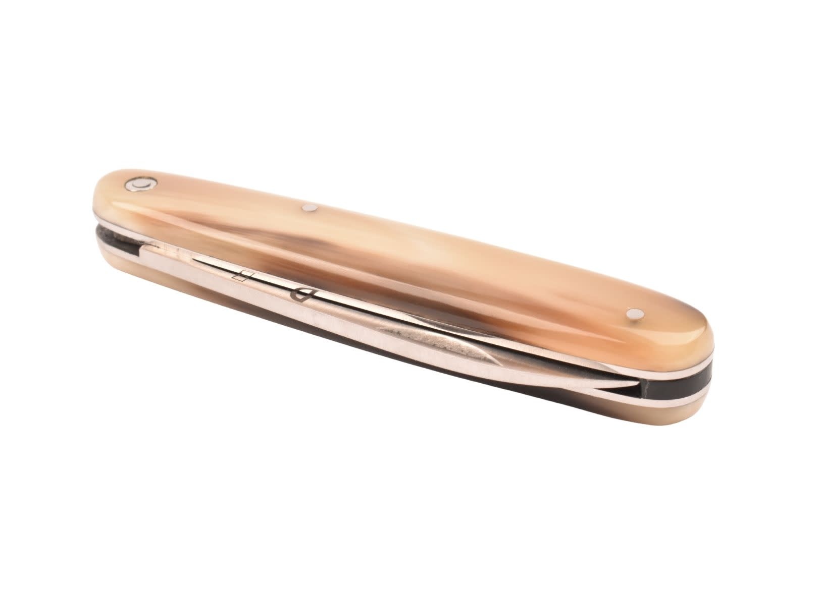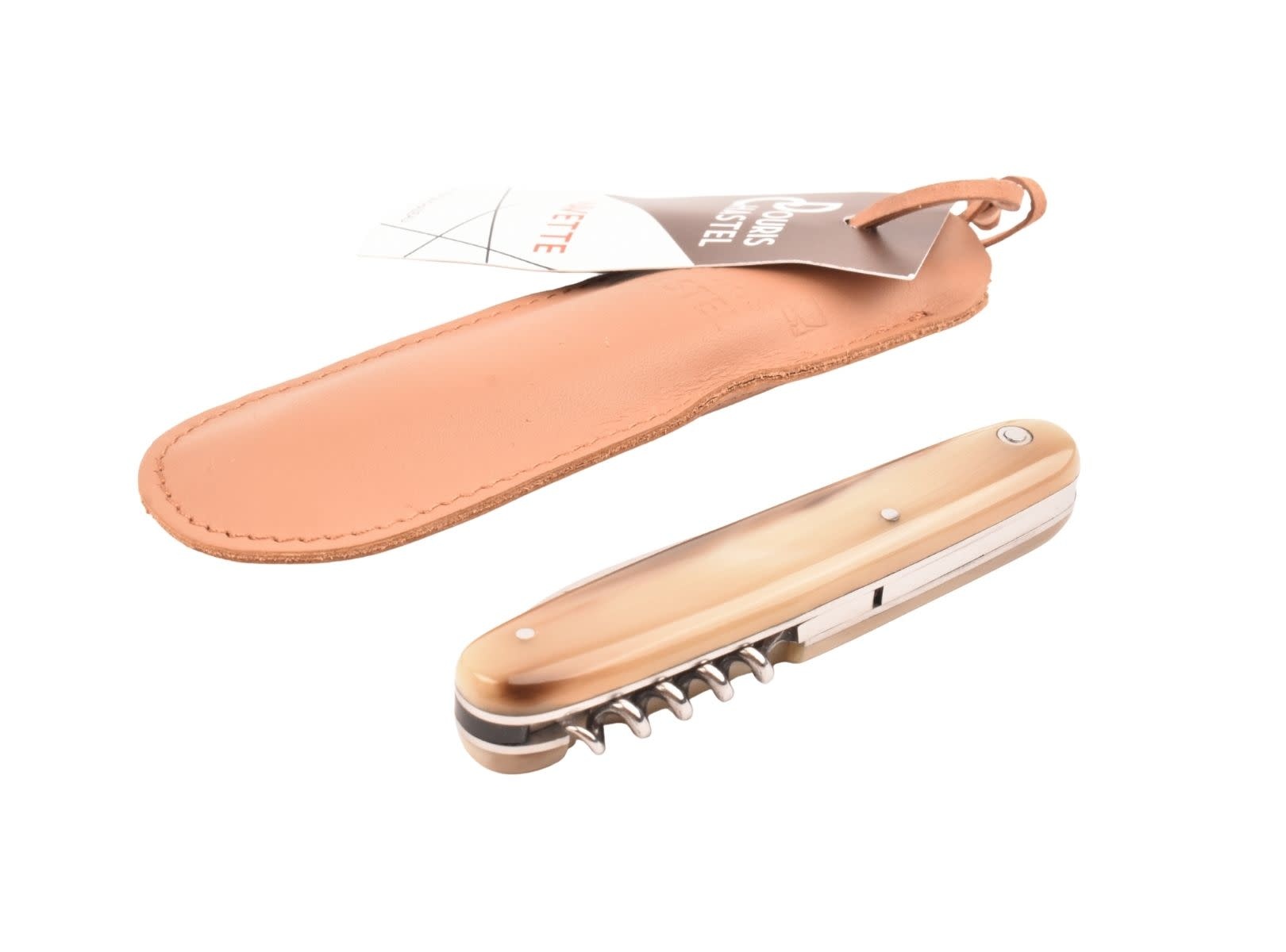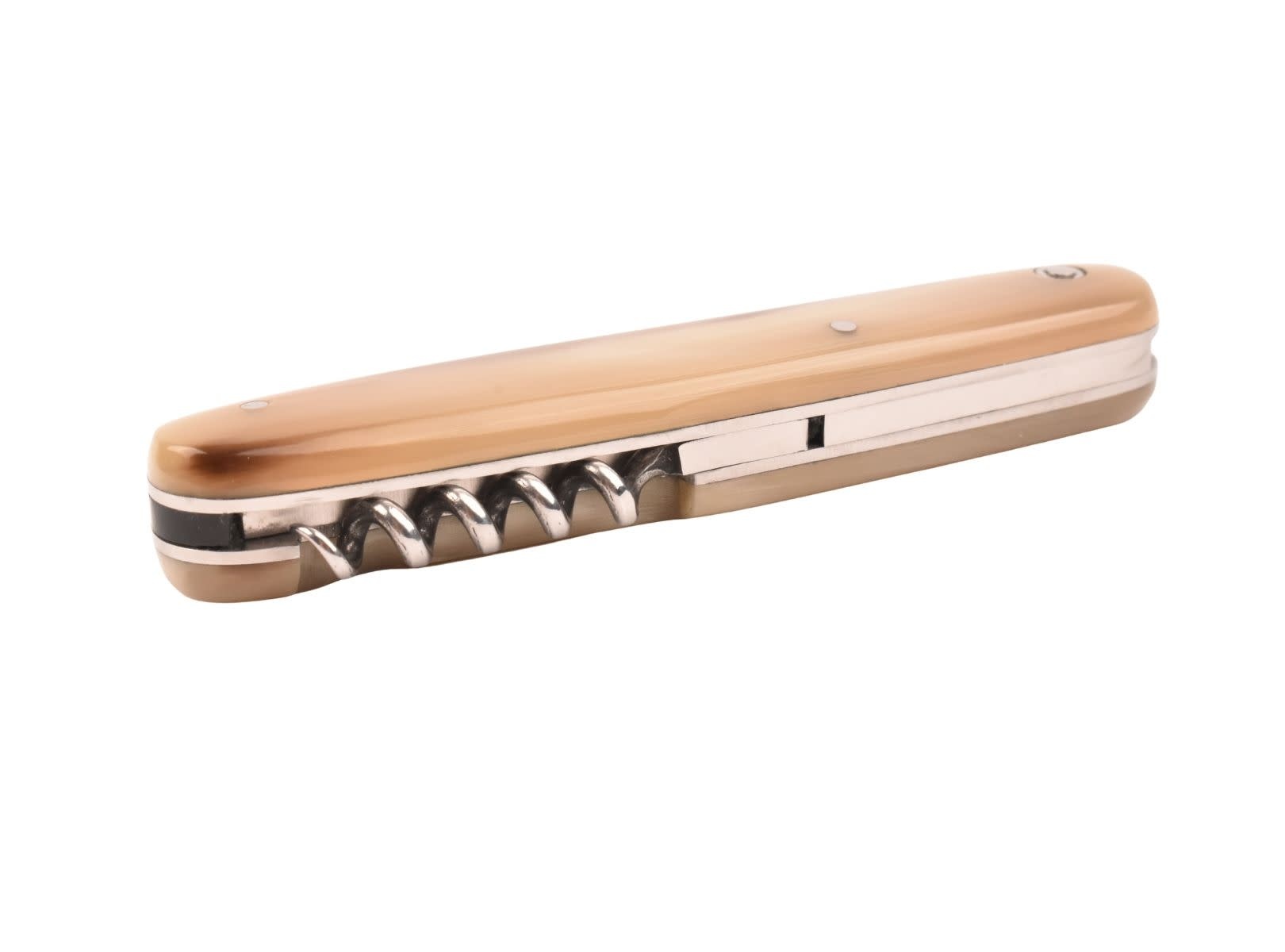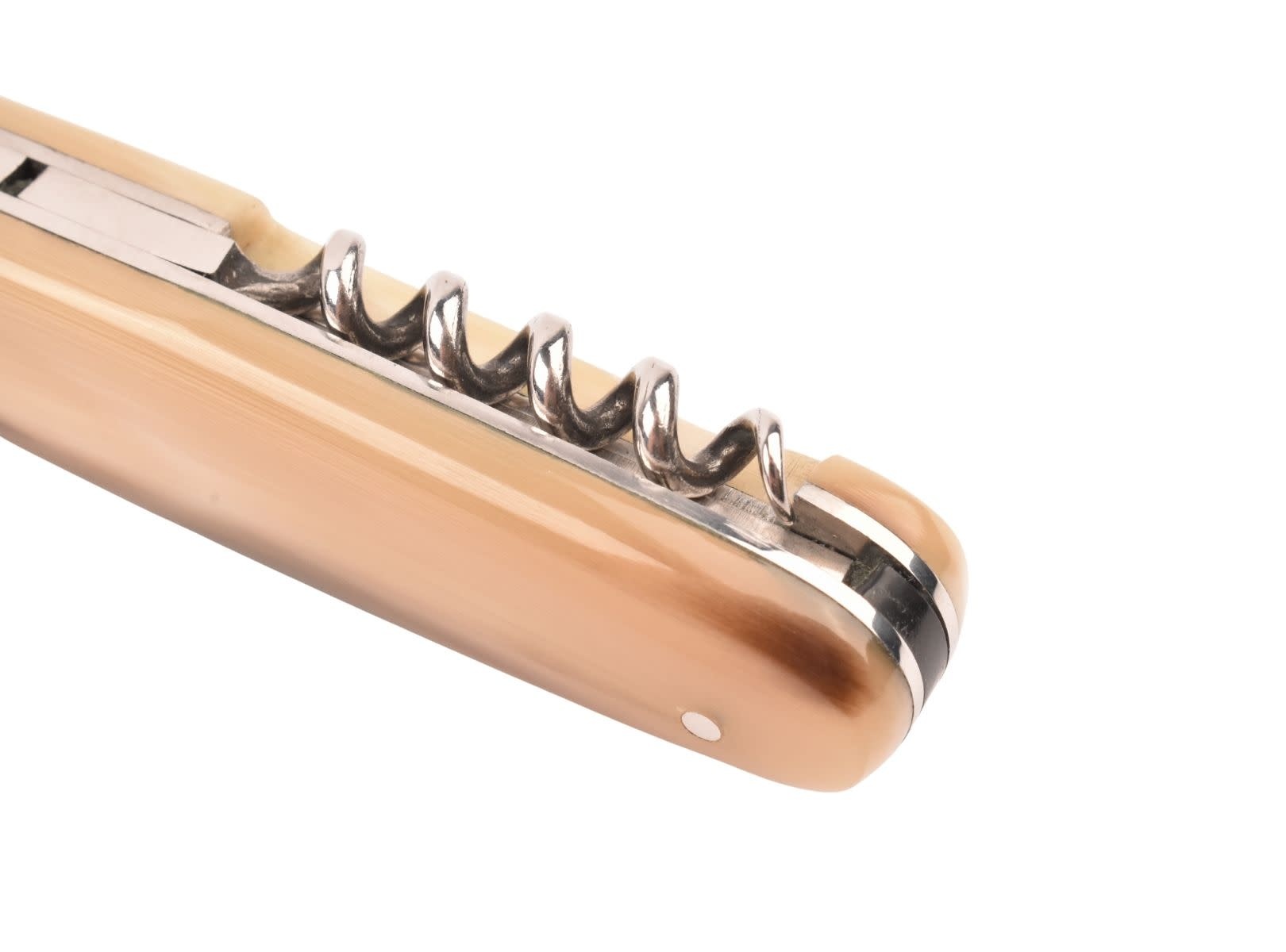 Dit mes heeft een volledig handvat uit punthoorn. Deze 2-delige versie heeft een klassiek lemmet van 7 cm en een kurkentrekker.