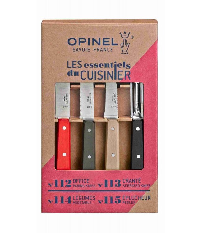 Essentieel keukengerei in verschillende kleuren van Opinel in handige set, met een oficemes, een gekarteld mes, een tourneermes en een dunschiller. Lees meer.