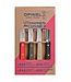 Deze set bevat de essentiële keukenbenodigdheden: een officemesje, een gekarteld mesje, een tourneermesje en een dunschiller. Alle lemmeten zijn gemaakt in roestvrijstaal en voorzien van een gelakt, gekleurd en houten heft. Het is aangeraden om de messen met de hand te wassen, aangezien de waterstralen van een vaatwasmachine de materialen zouden kunnen beschadigen op lange termijn.