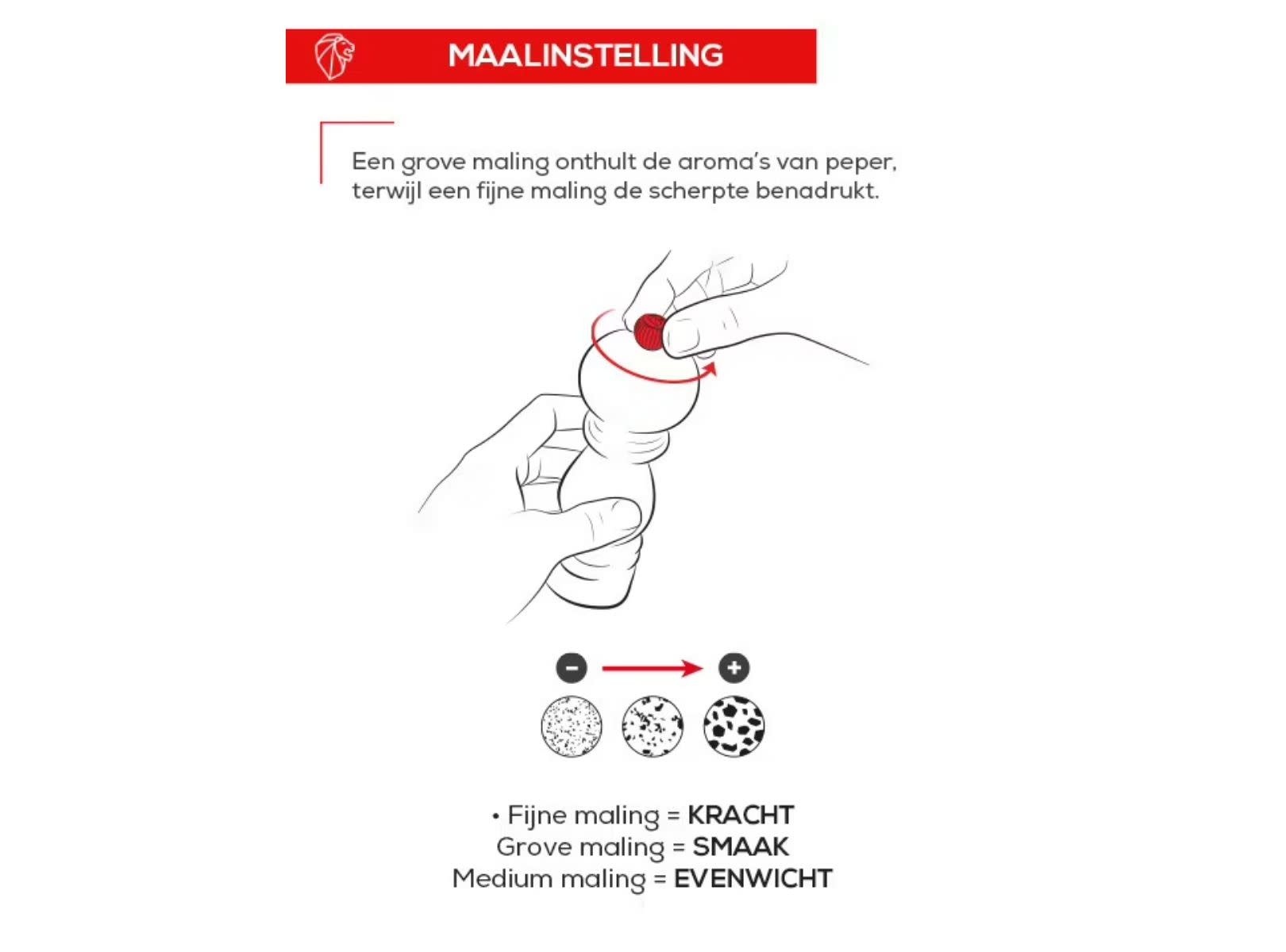 - Pepermolen: voor het malen van zwarte, witte, groene, rode en roze peper (max. 15% van de pepermelange) en korianderzaad