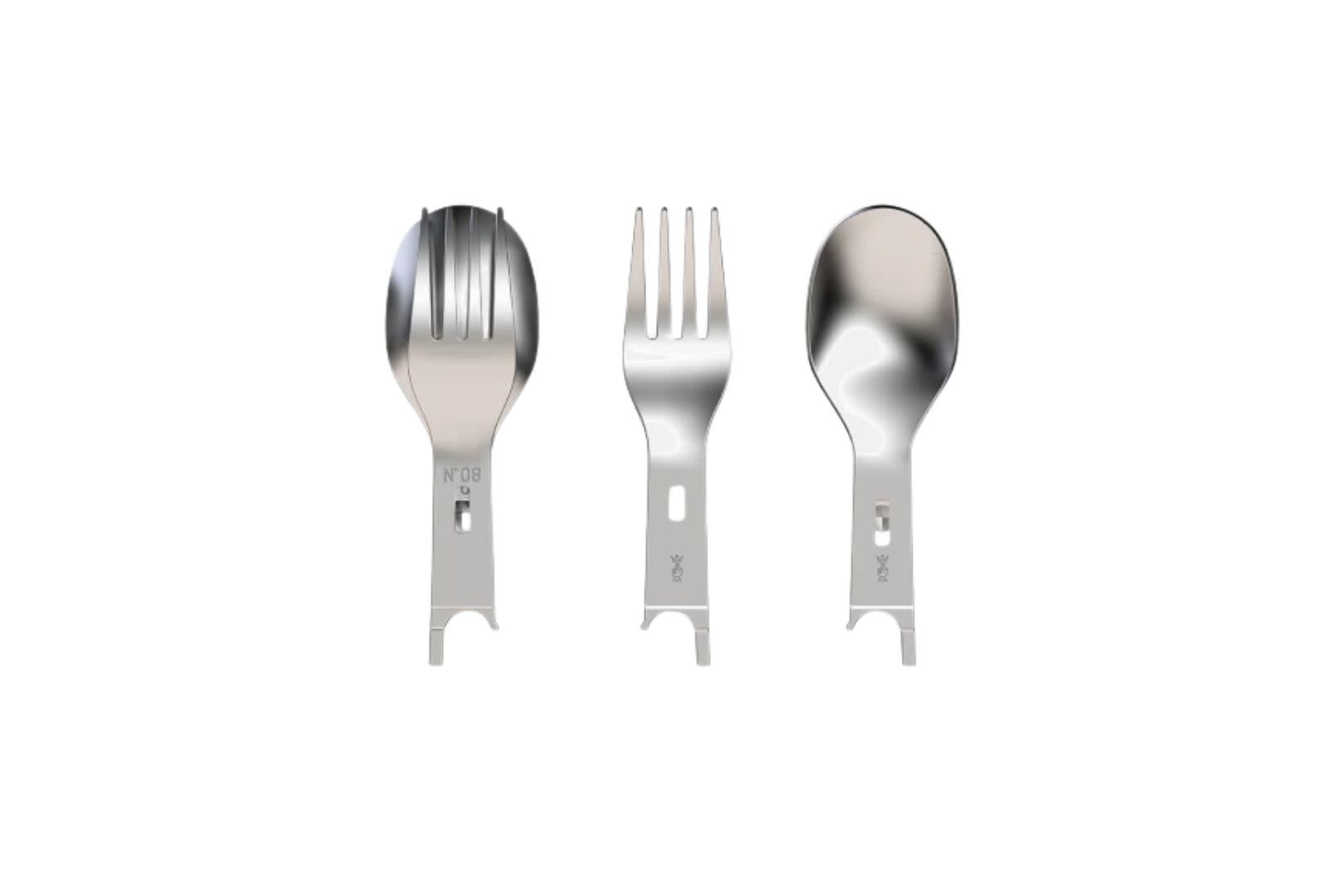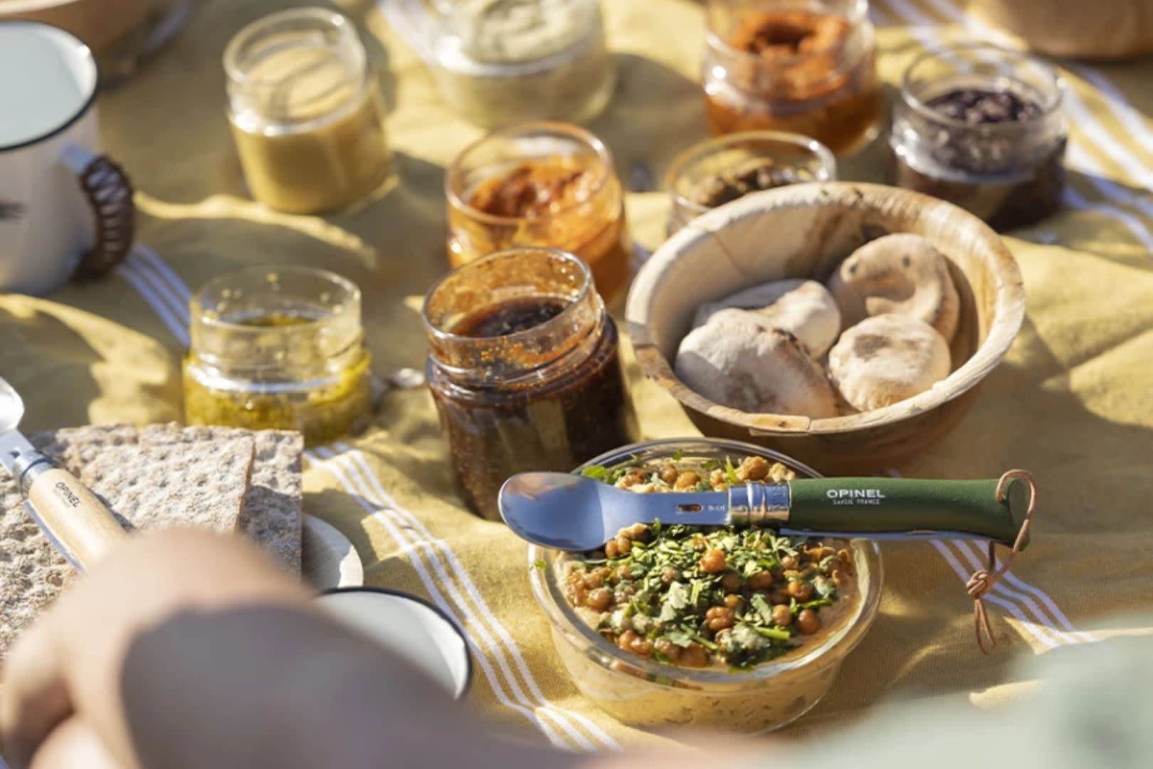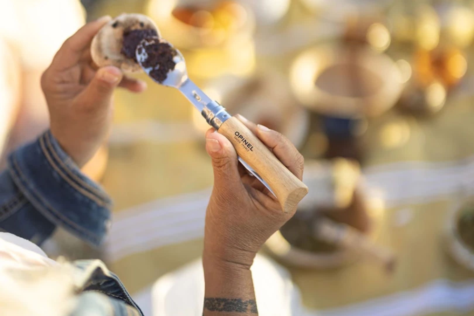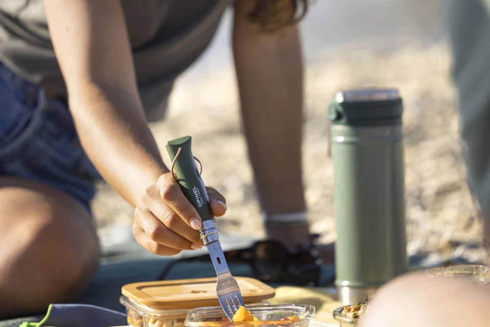 Tover uw Opinel N°08 zakmes om tot een lepel of vork, ideaal om onderweg je maaltijd te kunnen nuttigen of voor tijdens het wandelen, trektochten, bivakken of kamperen.