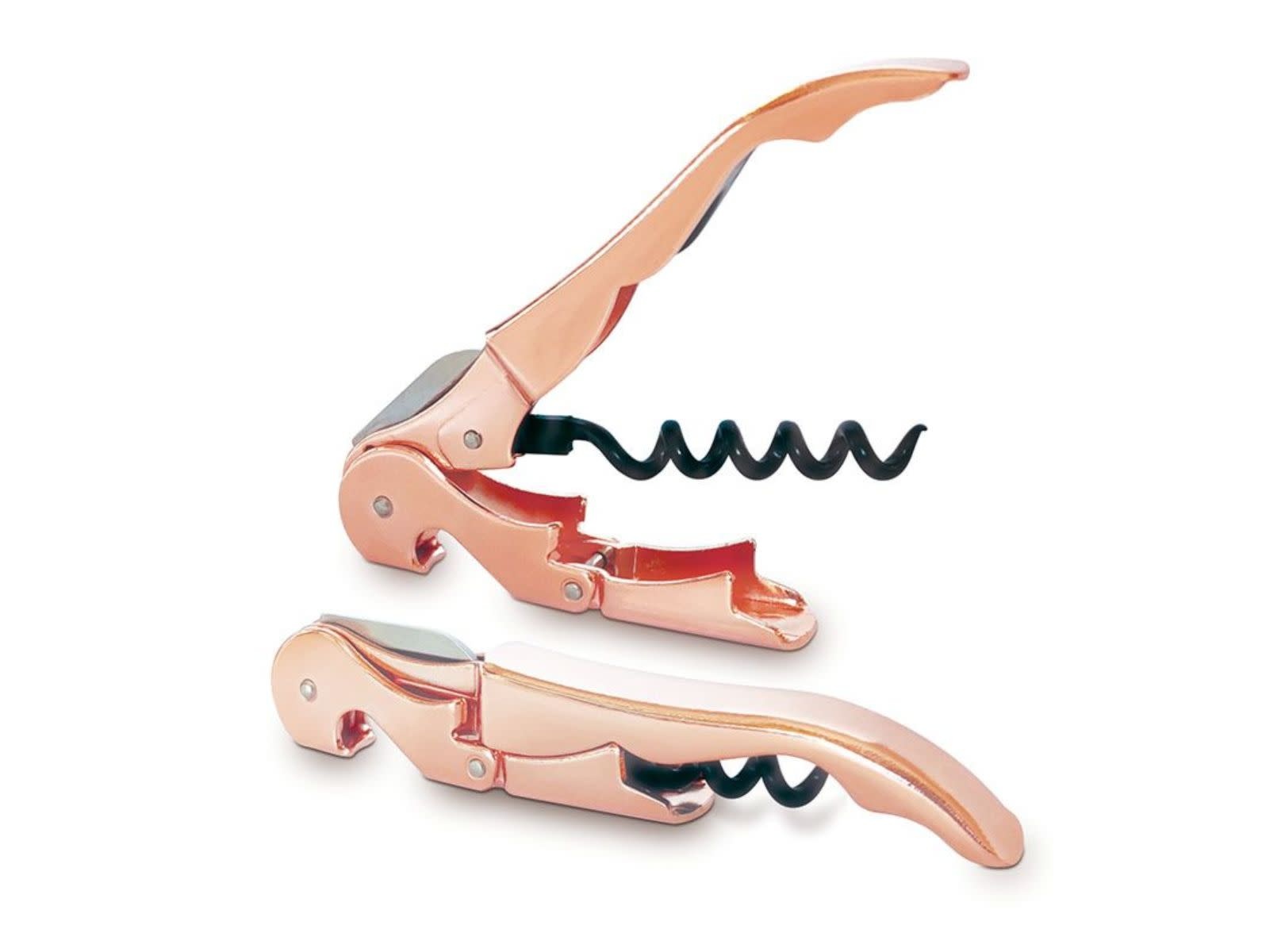 Het heft van deze handige kurkentrekker van Pulltex is vernikkeld rosé goud.