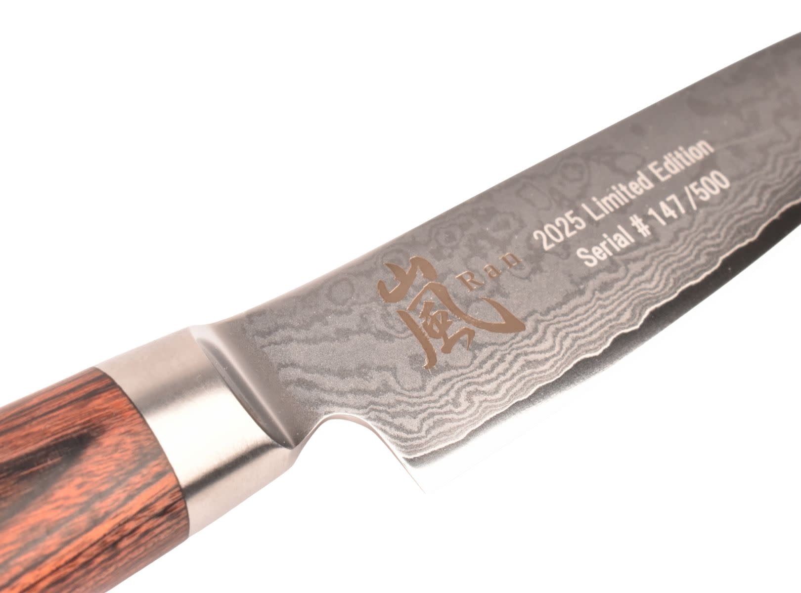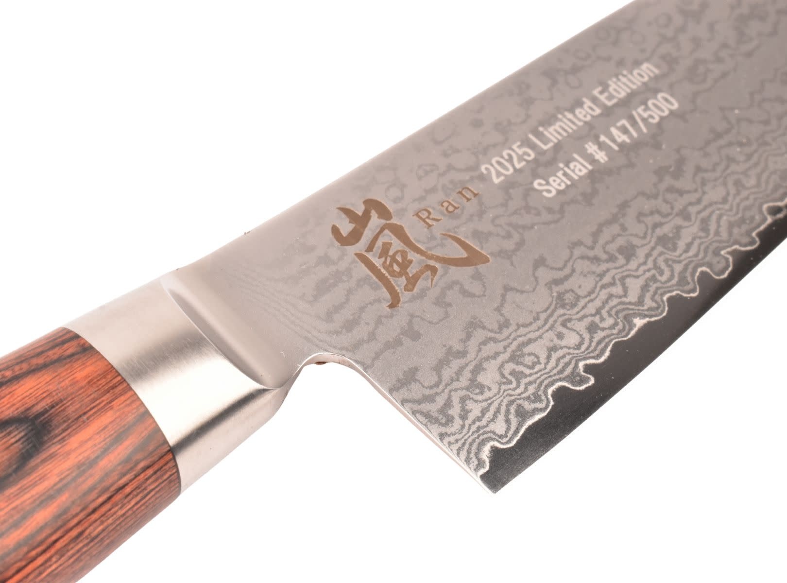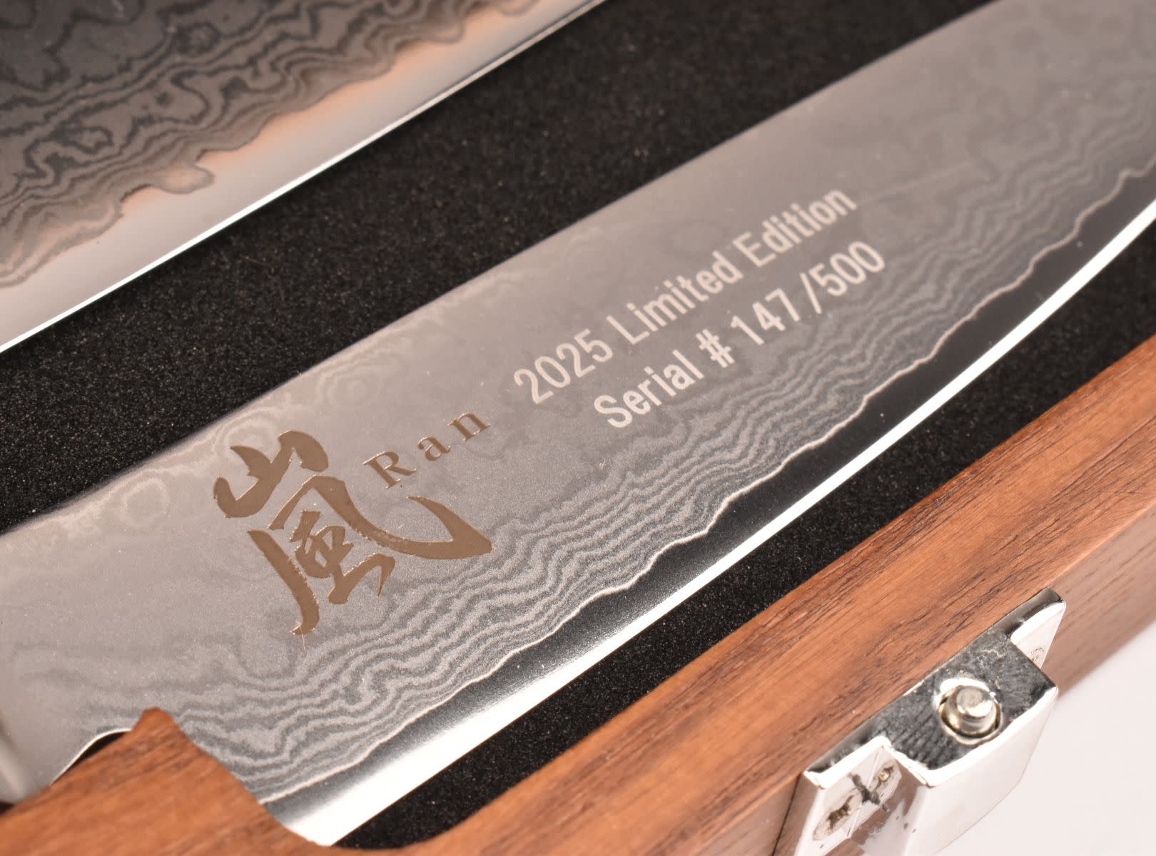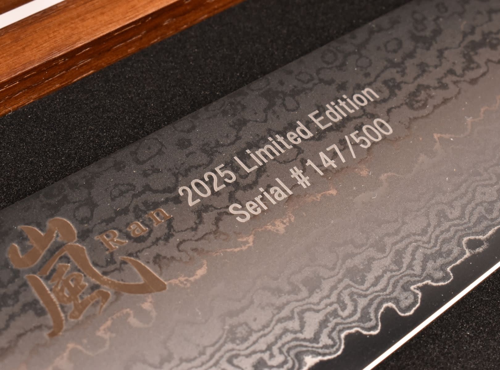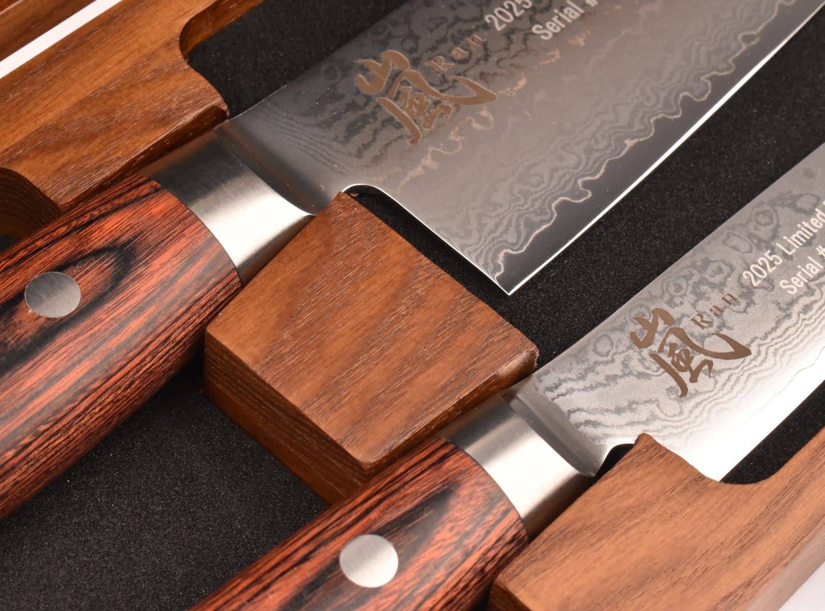 De lemmeten zijn handgesmeed in Seki, Japan en bieden met hun 61 HRC hardheid een uitstekende snijprestatie. De unieke damaststructuur komt prachtig tot zijn recht in combinatie met het diep gegraveerde serienummer en het ‘2025 Limited Edition’-opschrift. De ergonomische handgrepen zijn gemaakt van mahoniehout en zorgen voor een comfortabele, natuurlijke grip tijdens het koken, zowel voor links- als rechtshandige gebruikers.