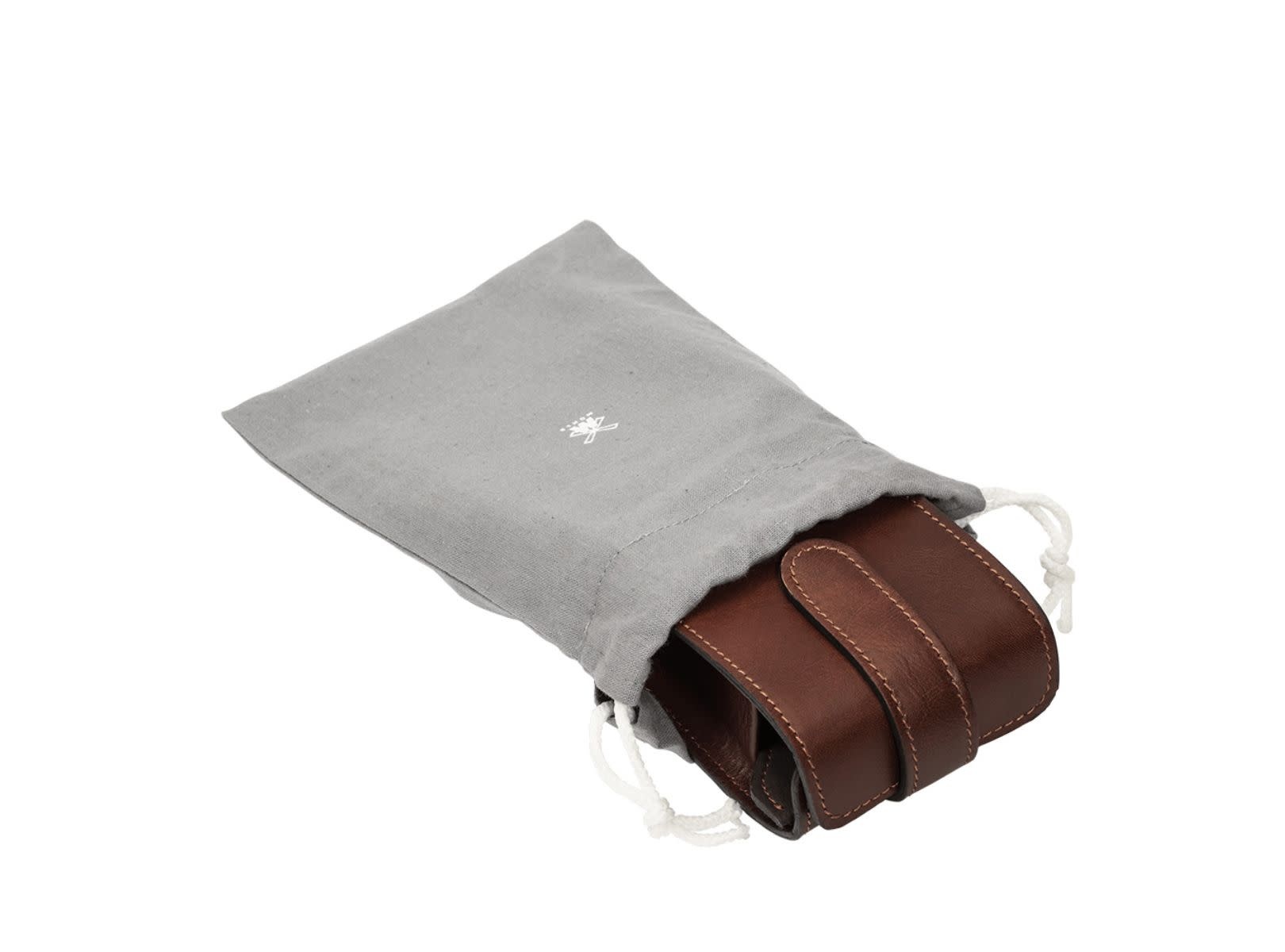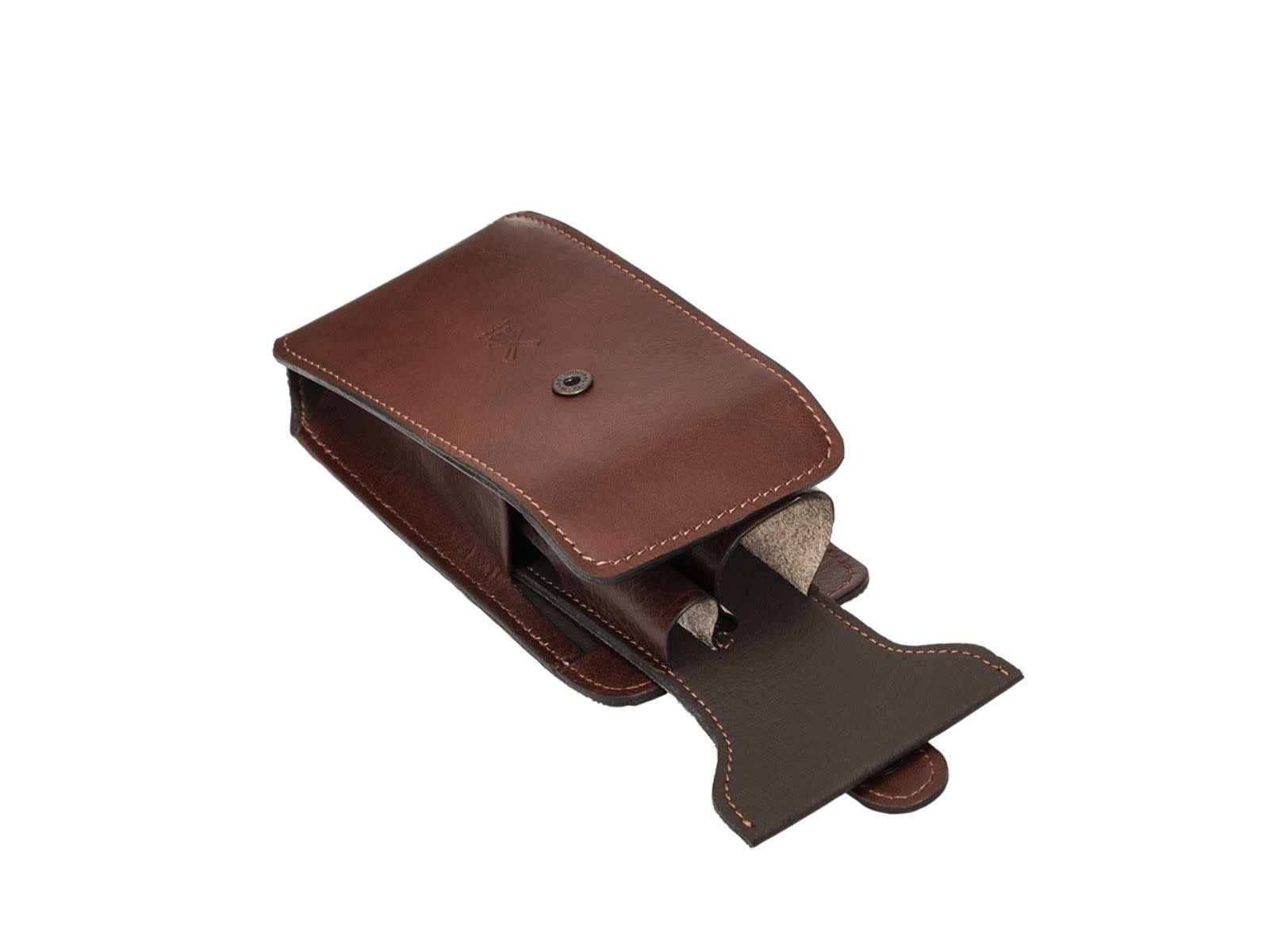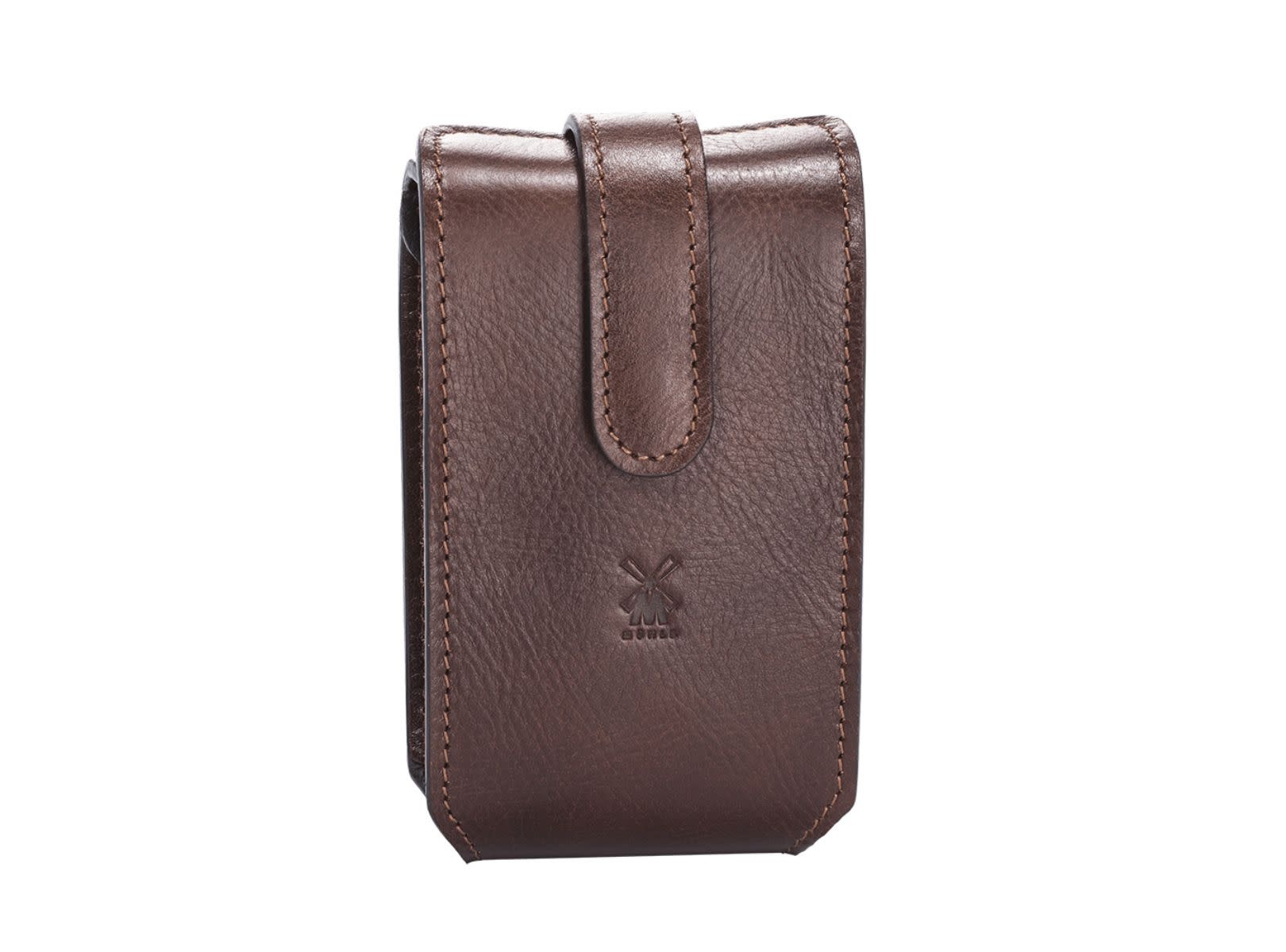 Hoogwaardige bruine lederen etui voor het opbergen van Muhle reisscheersets, met een uitneembare insert voor kwasten en scheermesjes.