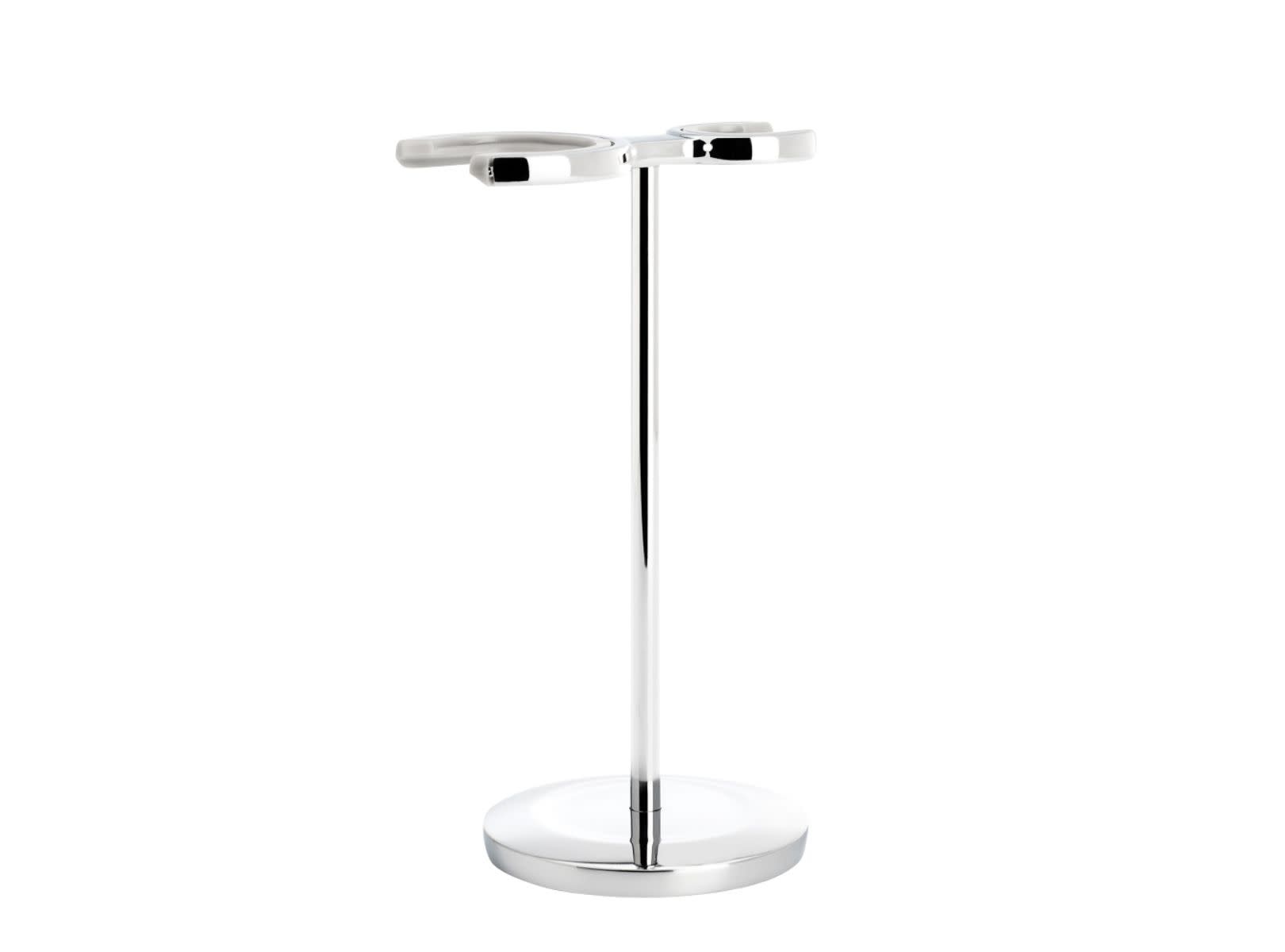 Zowel de synthetische kwast als het scheermes zitten stevig vast in een gechromeerde houder.