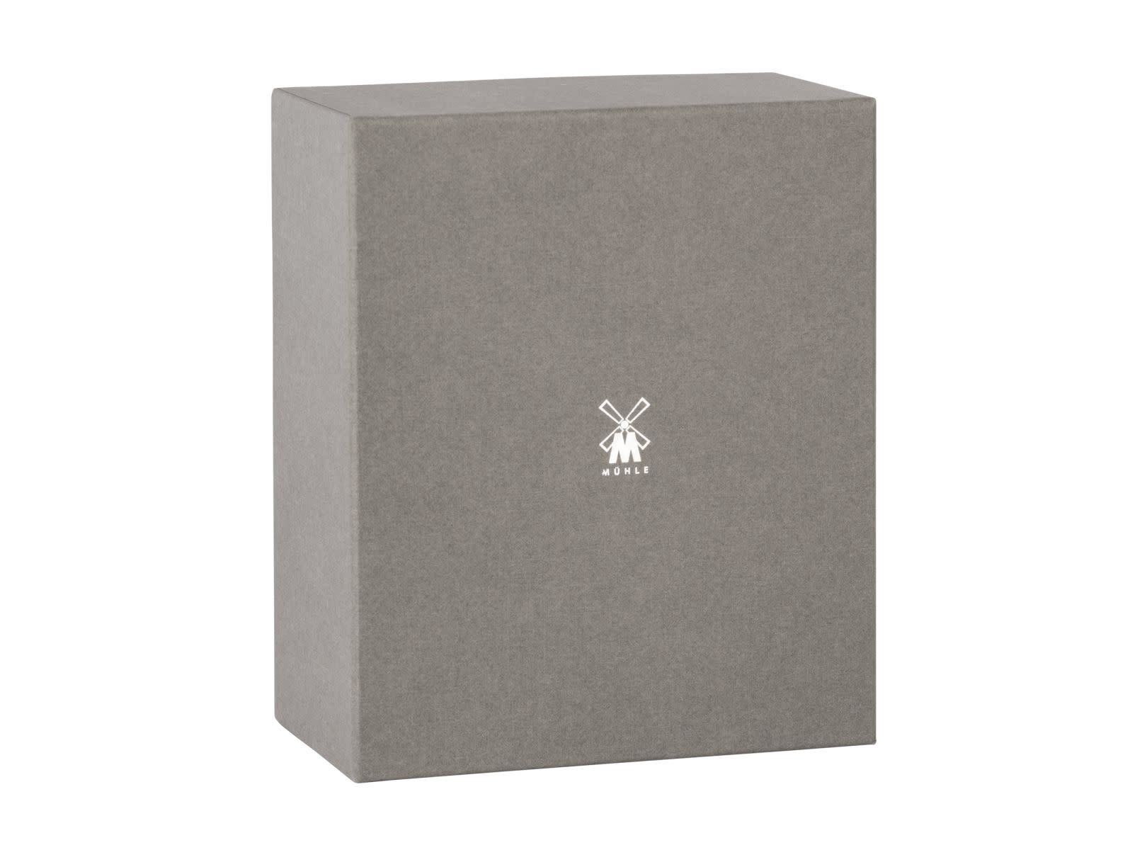 Muhle Rytmo scheerset in zwart edelhars is een hoogwaardige, tijdloze driedelige scheerset bestaande uit een synthetische scheerkwast (black fibre®), safety razor scheermes en een verchroomde metalen standaard.