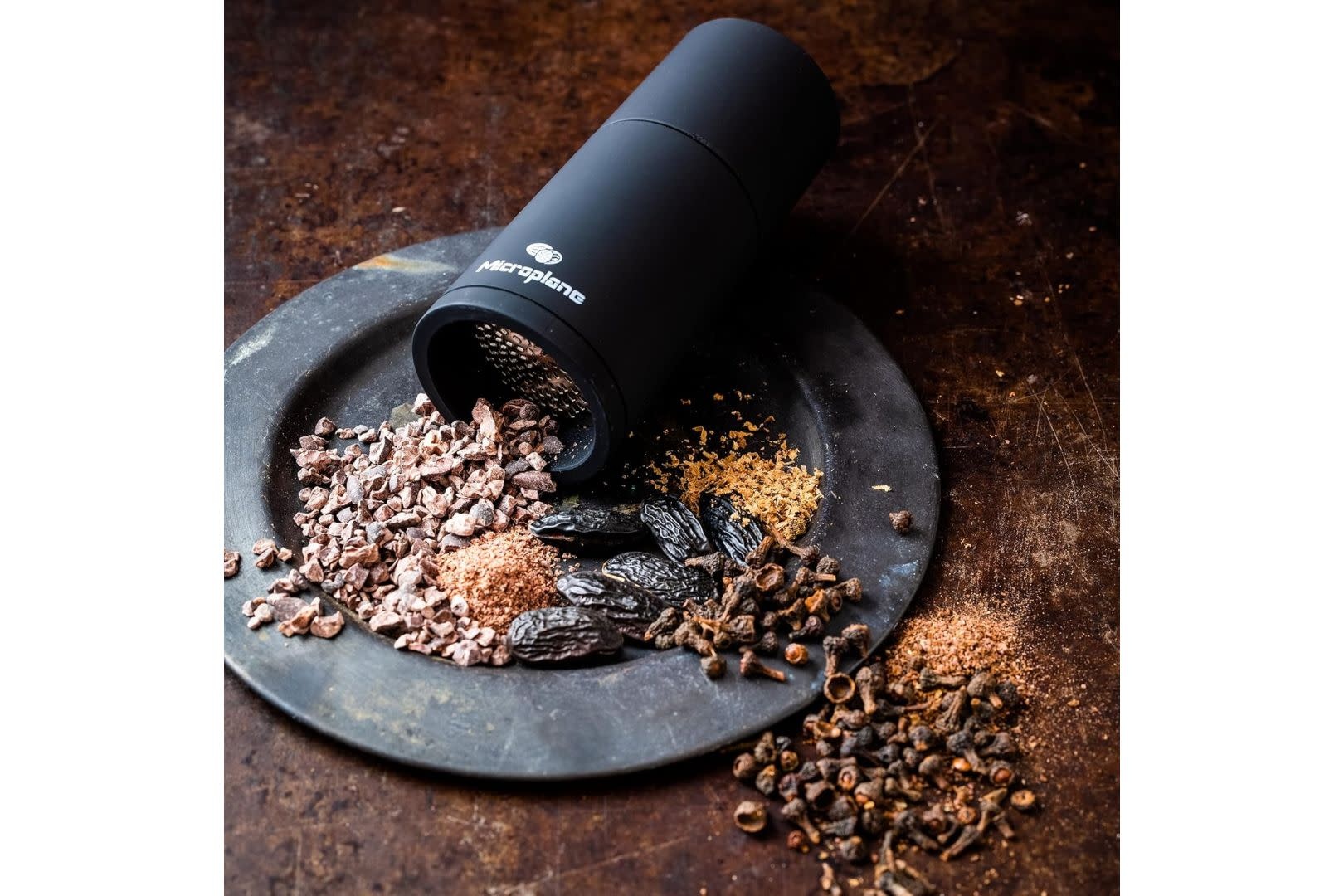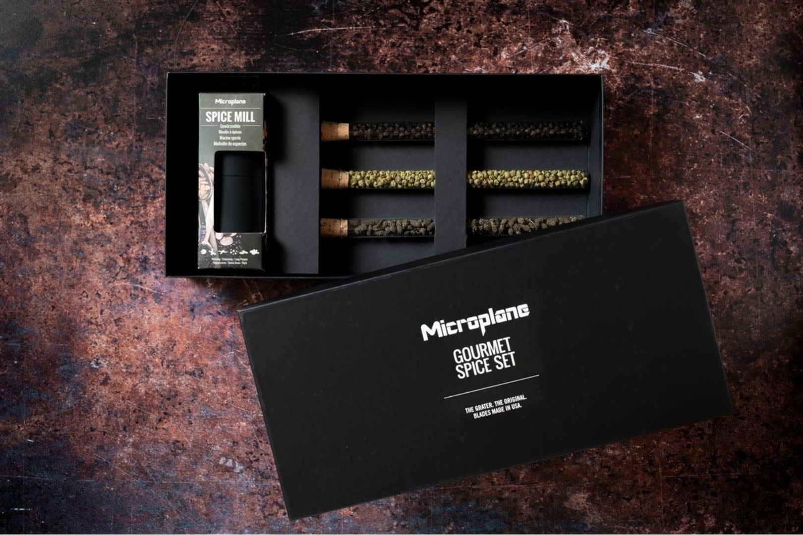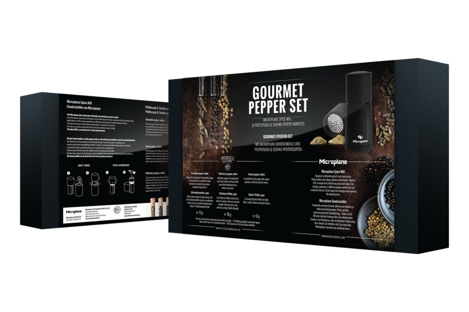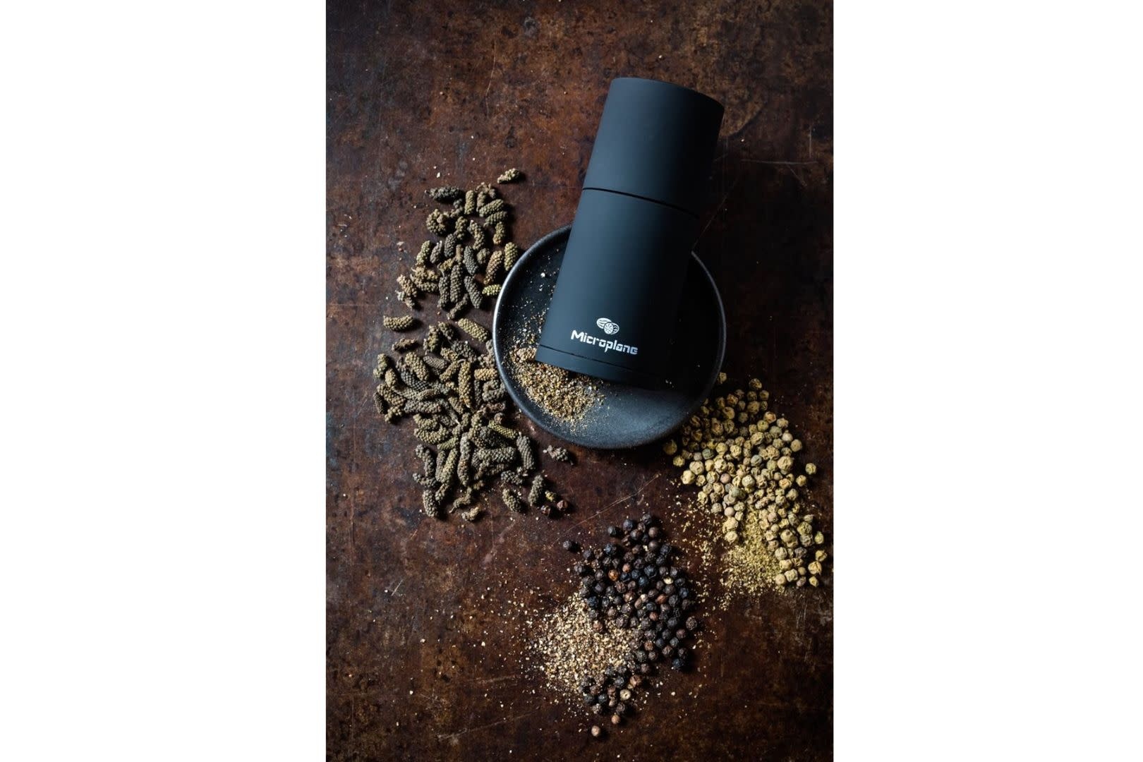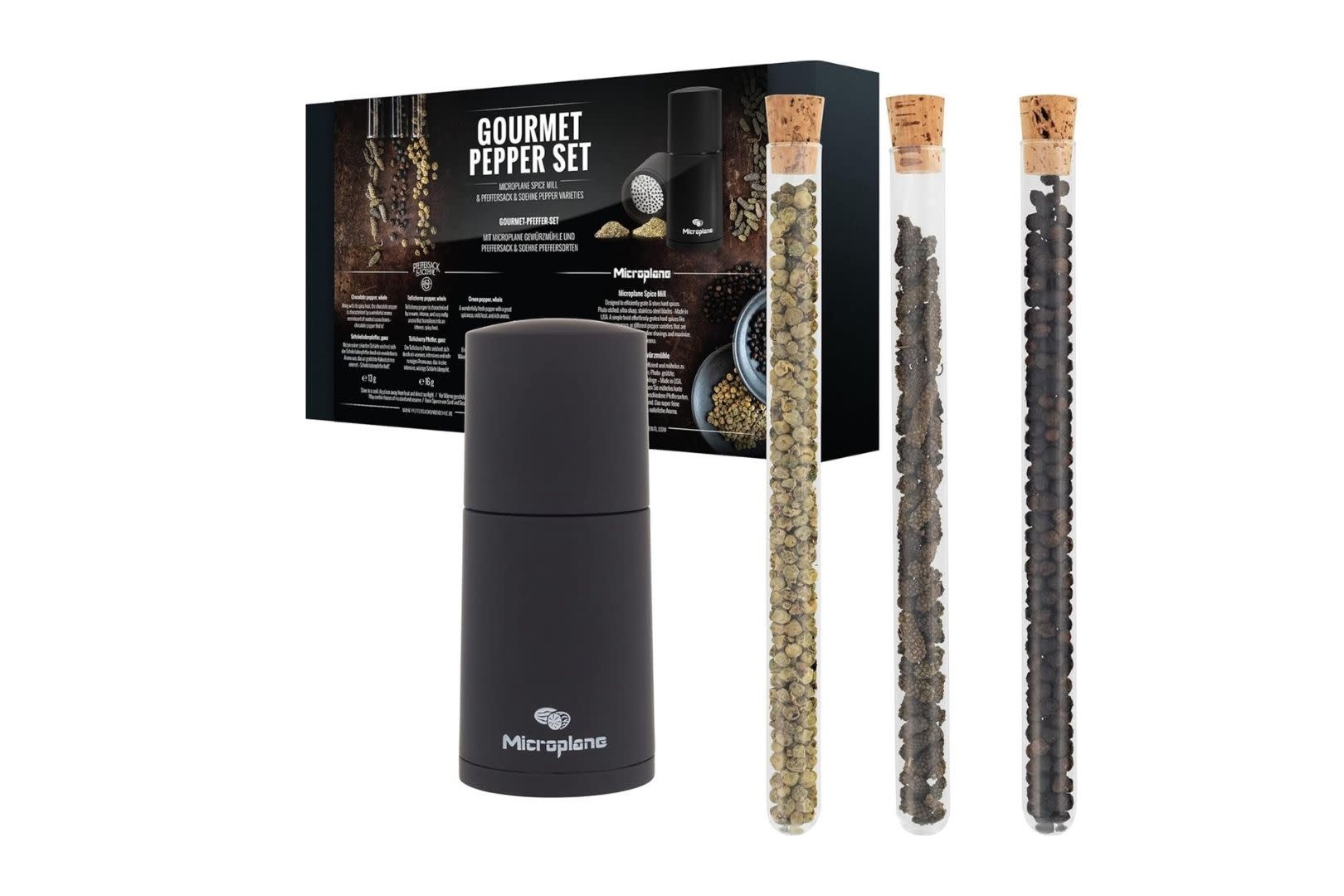 Microplane set nootmuskaatmolen zwart met 3 soorten peper