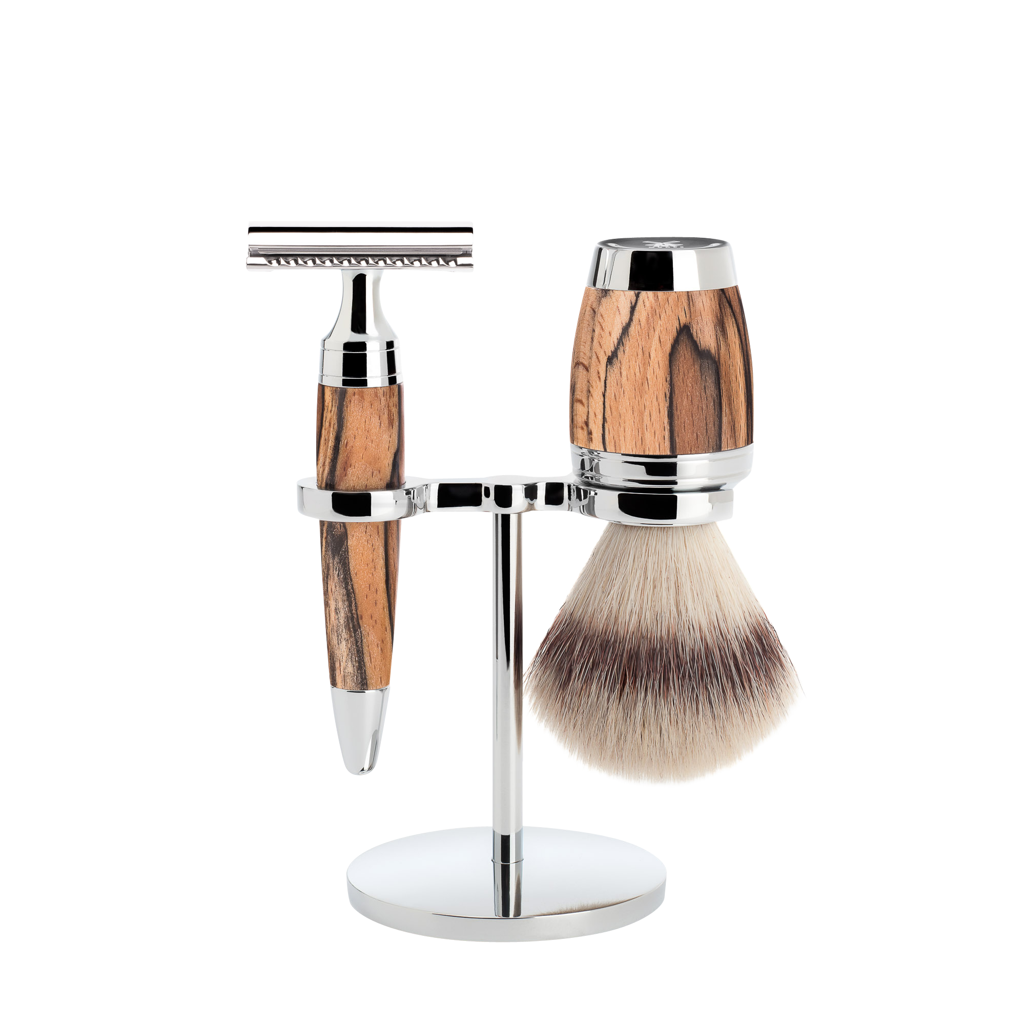 Muhle Purist scheerset in berk met safety razor scheermes en silvertip dassenhaar kwast