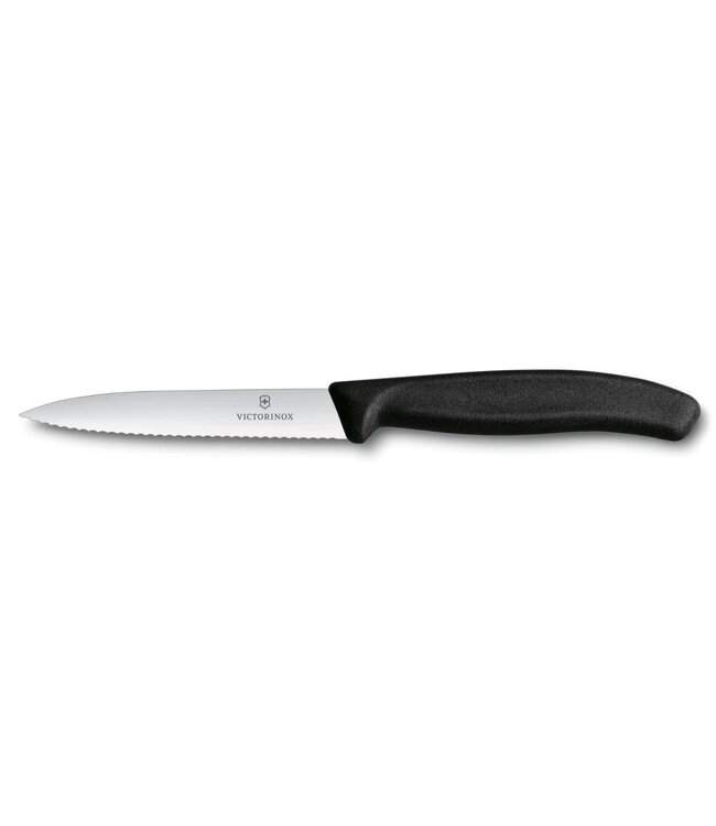 Victorinox Swiss Classic gekarteld groot officemes met zwart heft, gegolfde rand en spitse punt. Uitermate geschikt voor het snijden van tomaten, avocado's en vijgen, en snijdt moeiteloos door granaatappels, lychees en passievruchten. Lees meer.