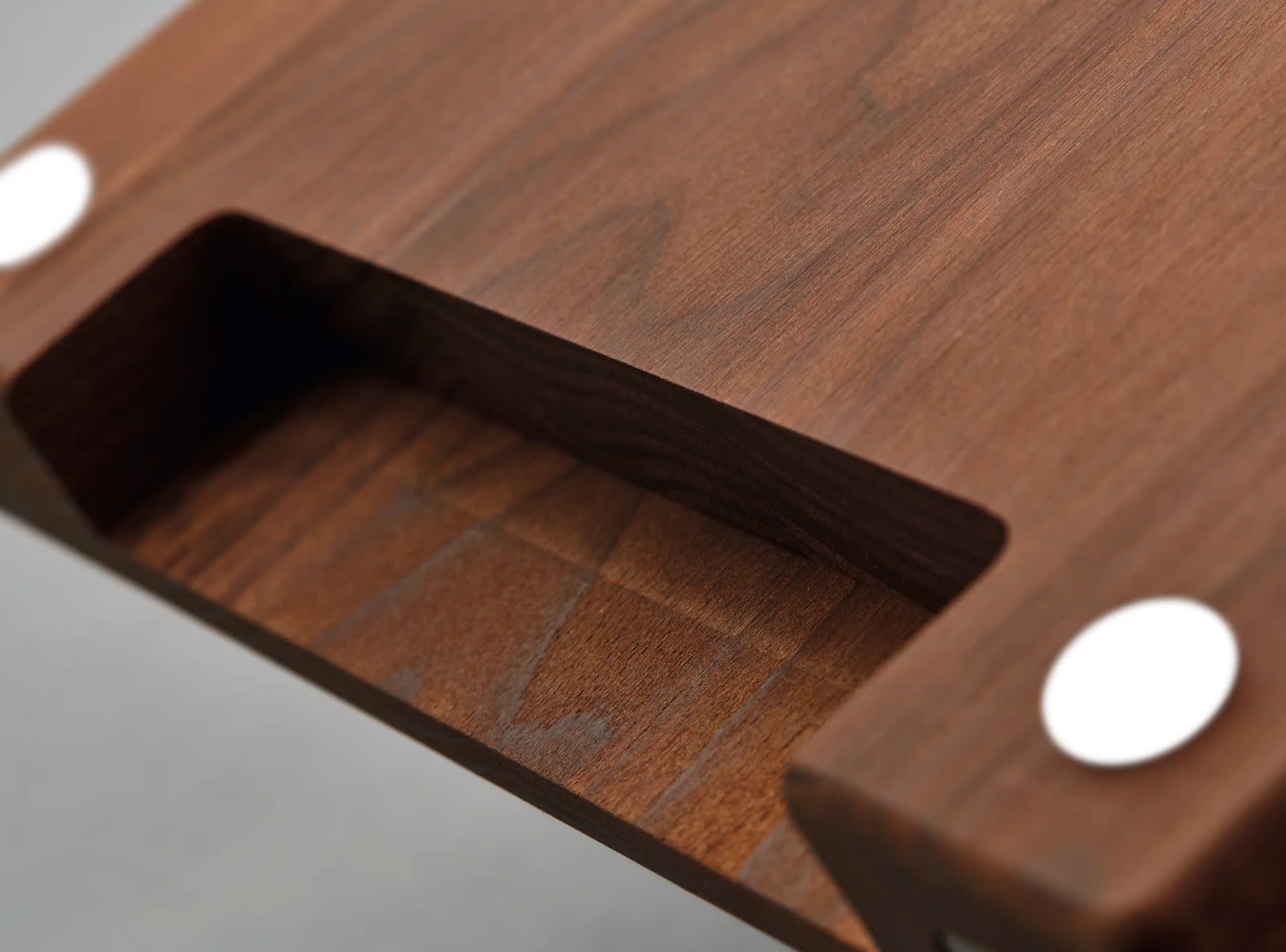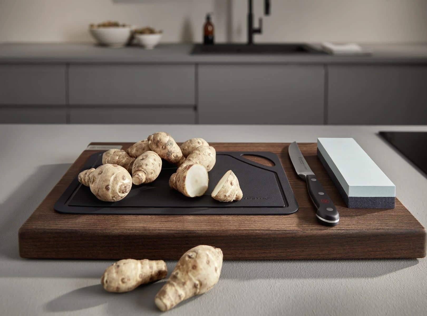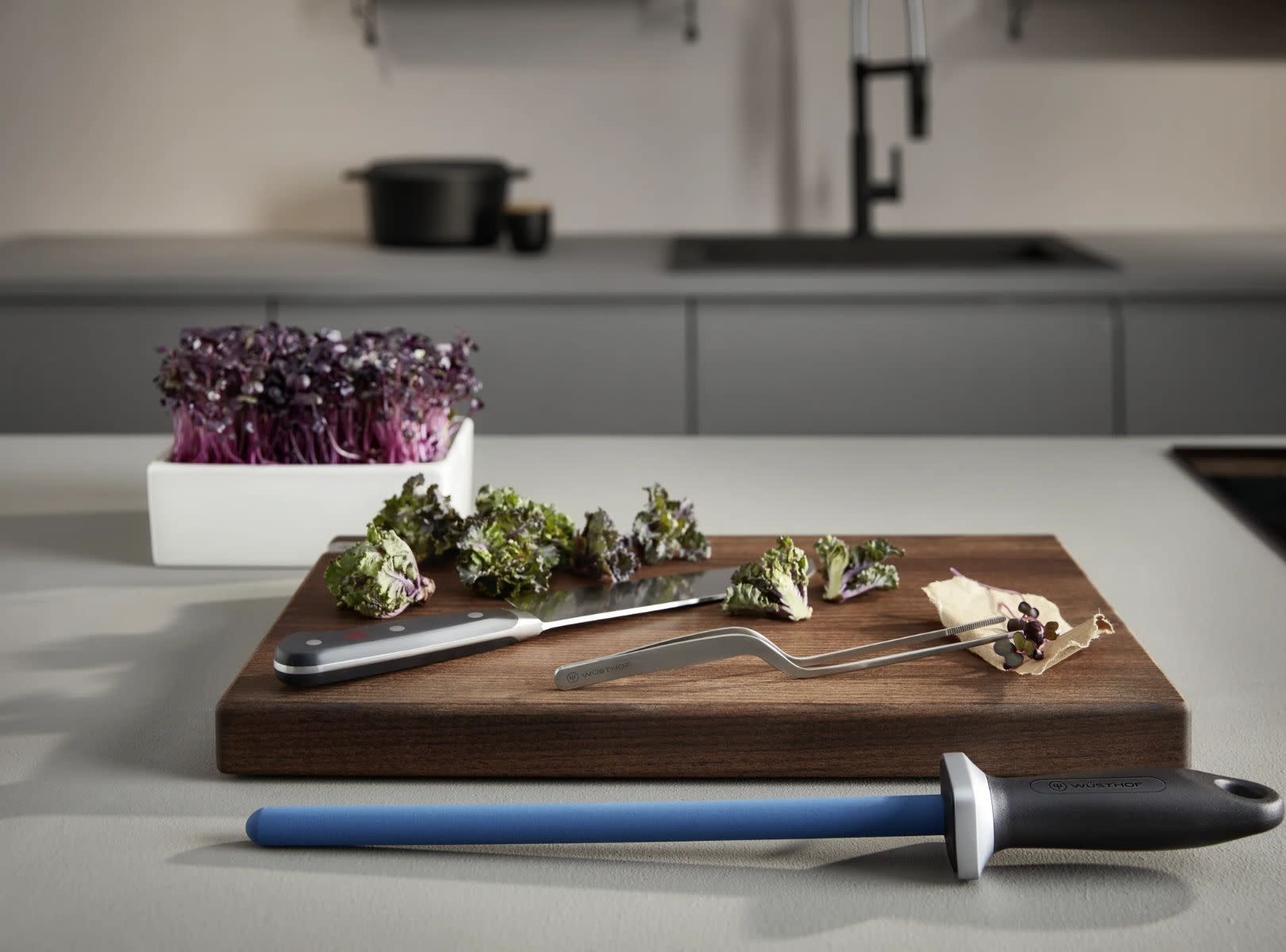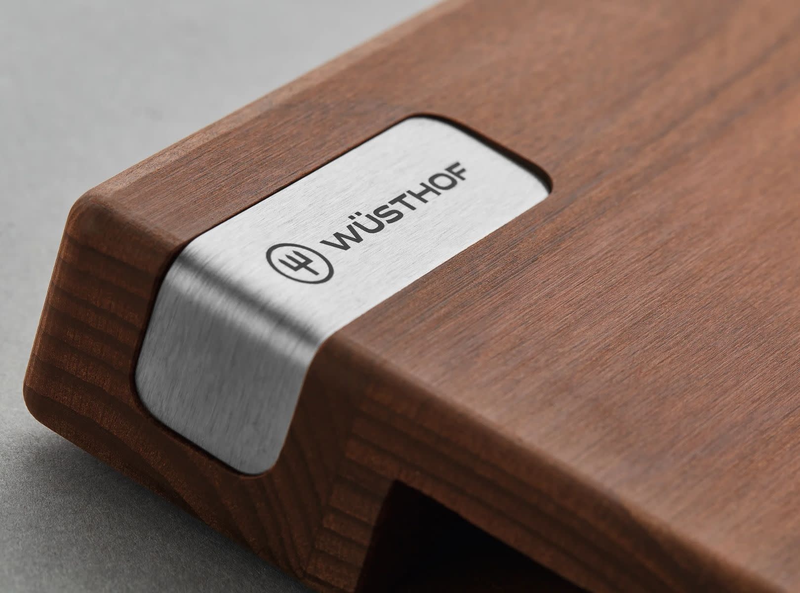 In de snijplank zitten 2 uitsparingen waarmee je het makkelijk kan verplaatsen. Onderaan zijn ook rubberen voetjes te vinden die ervoor zorgen dat de plank niet zomaar van het keukenoppervlak glijdt. Het rvs Wusthof logo geeft de snijplank een luxe uitstraling.