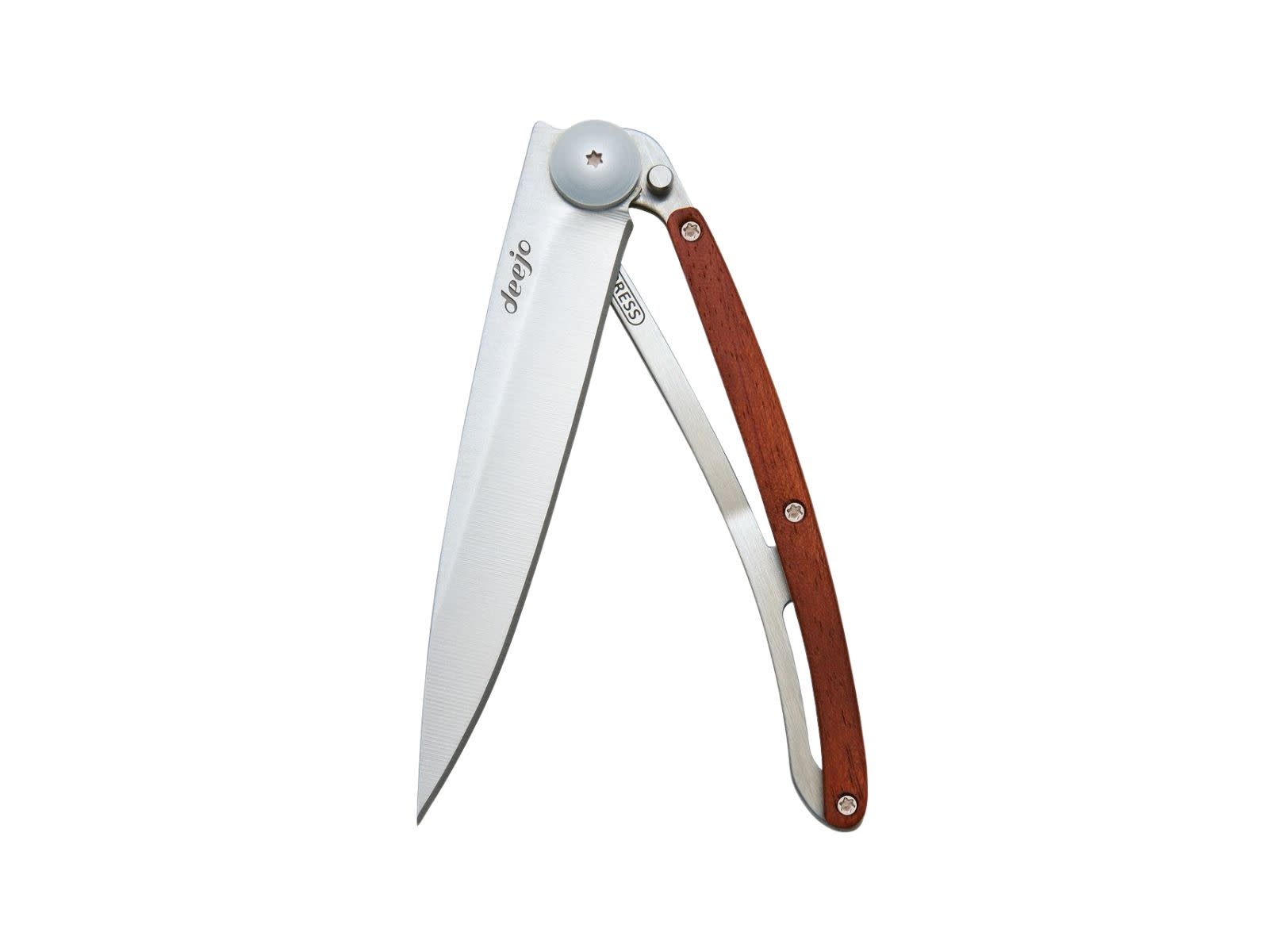 Het heft van uw Deejo mes is vervaardigd uit massief koraalhout (of padoek). Dit hout is al lang geliefd in bestek vanwege de kostbare rood/amberkleurige accenten, de robuustheid en de uitstekende vochtbestendigheid. Hier onderstreept het op prachtige wijze de elegantie van een Deejo-mes.