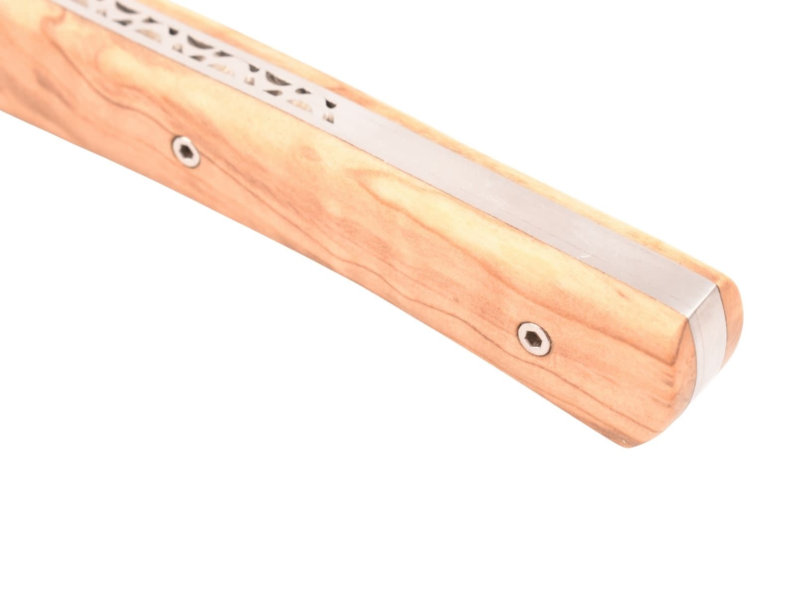 Het volle handvat is gemaakt van olijfhout, een verfijnde houtsoort met mooie schakeringen. De bevestiging gebeurt met 3 BTR-schroeven.