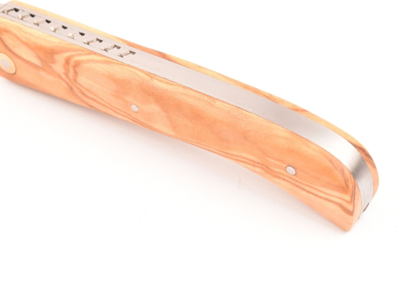 Met een comfortabele handgreep en dankzij het compacte formaat neem je zit zakmes in olijfhout overal mee naartoe. Het zakmes is door zijn lichtgewicht (67 gram) uiterst geschikt voor dagelijks gebruik. De met de hand vervaardigde, versierde rug geven het mes een elegante uitstraling. Het zakmes is gemonteerd met een messing rozet.