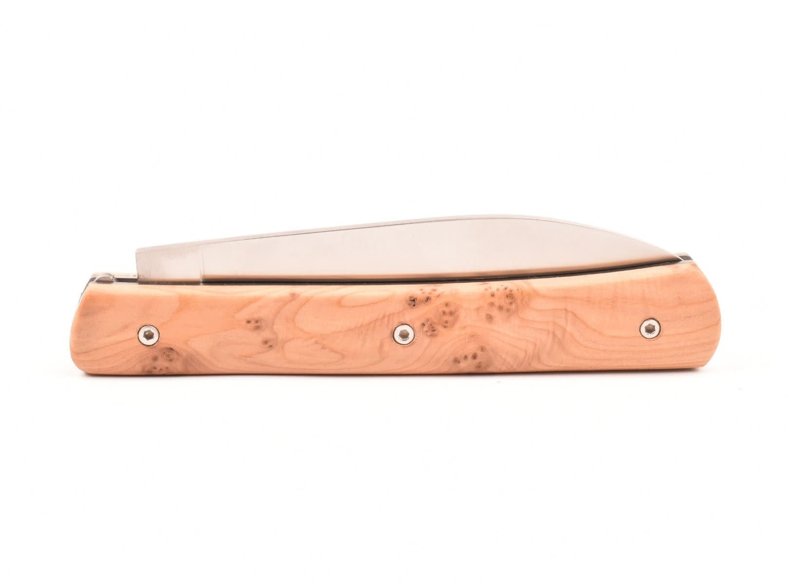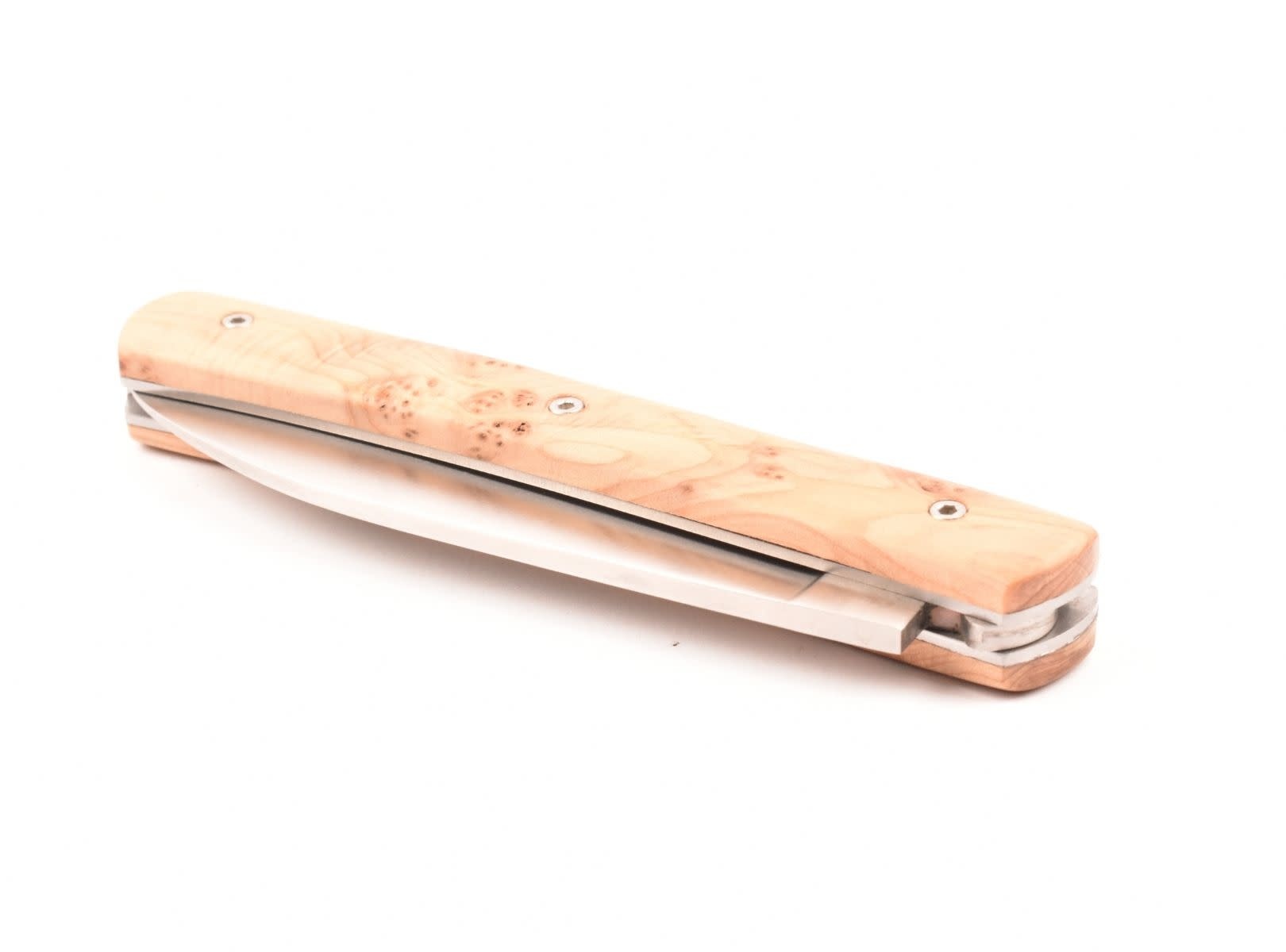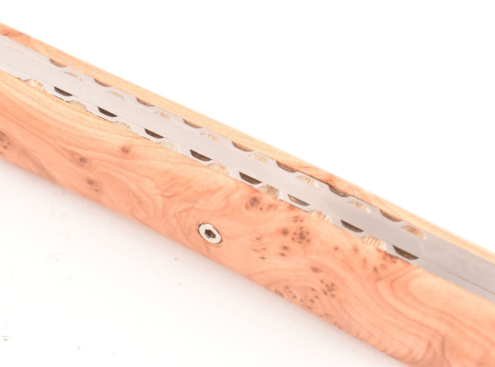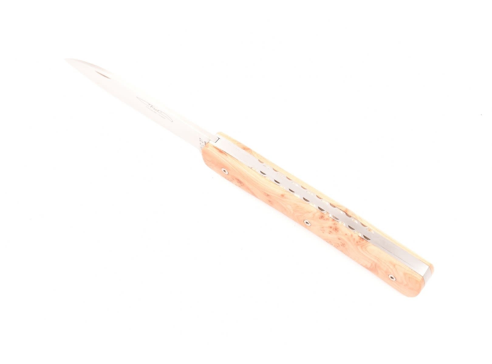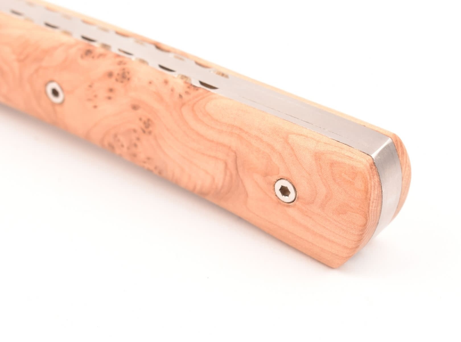 De zuivere, lange lijn van dit TMC zakmes nodigt ons uit tot een zen-gevoel! De handgreep van het zakmes is gemaakt uit jeneverbes. De schroefgrepen geven het product een zeer mooie uitstraling. De met de hand vervaardigde, versierde rug op de achterkant is discreet en elegant.