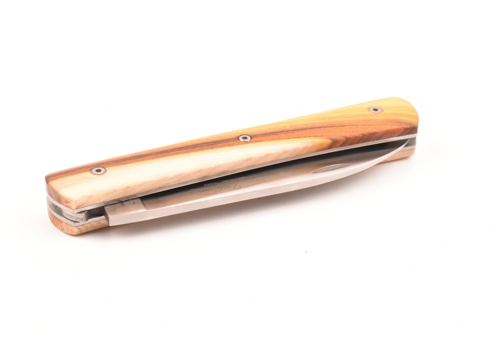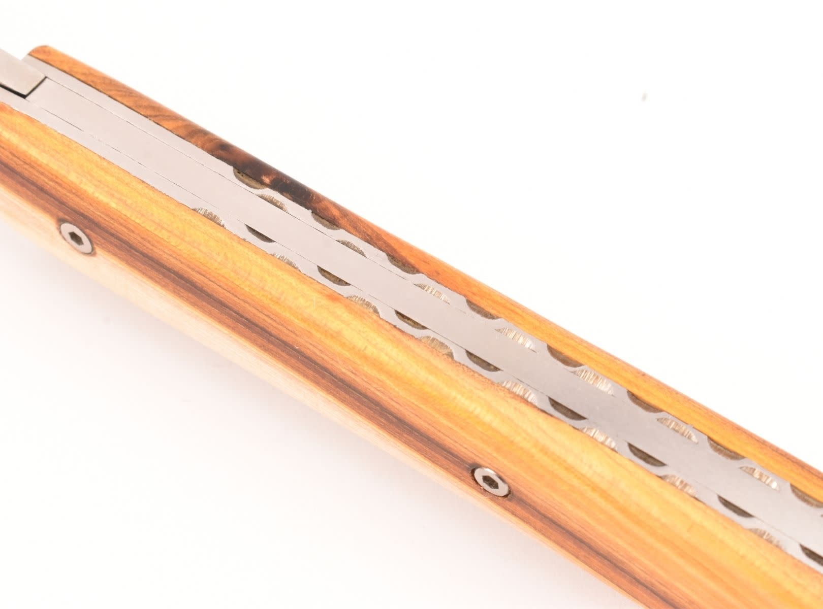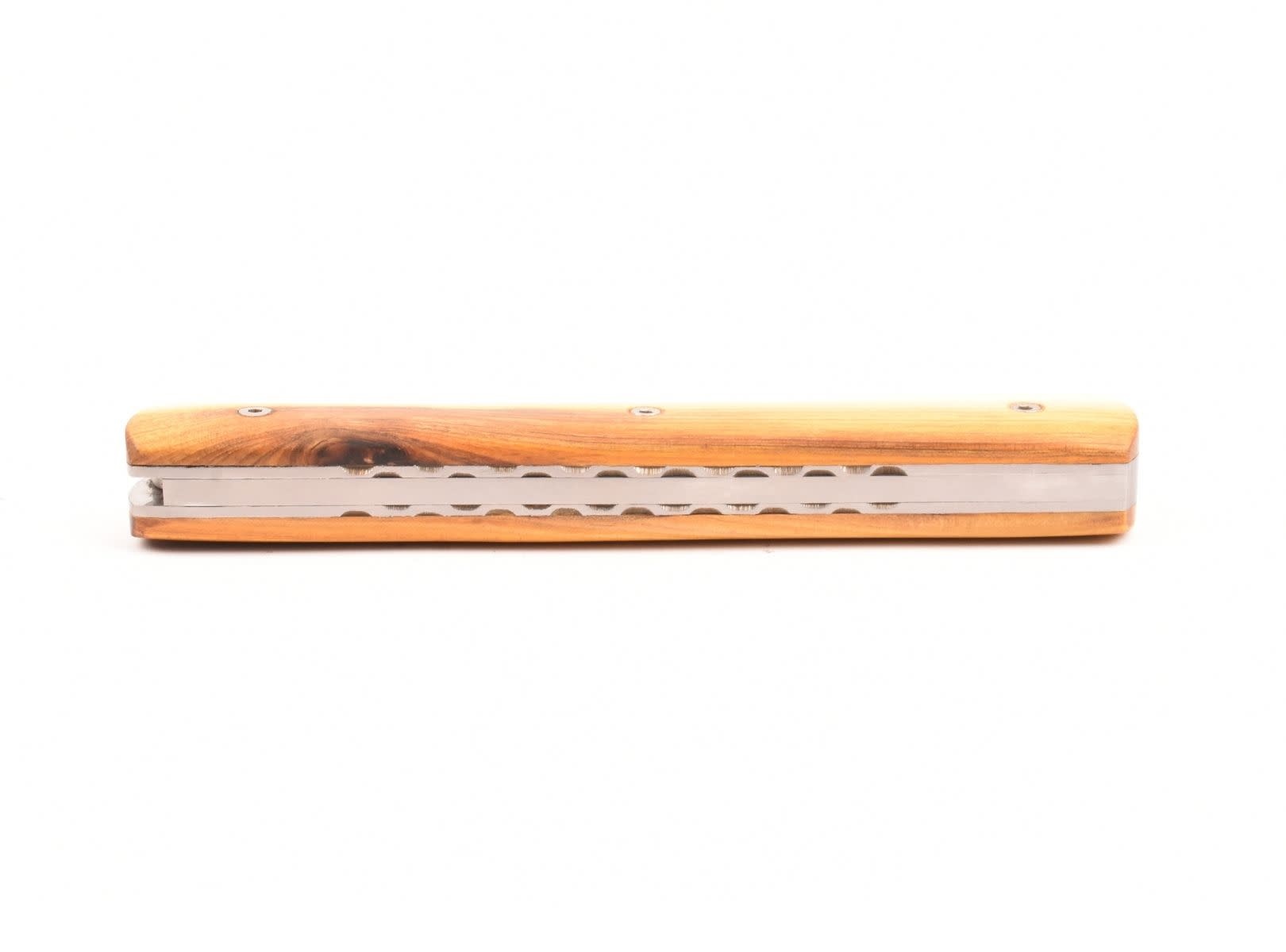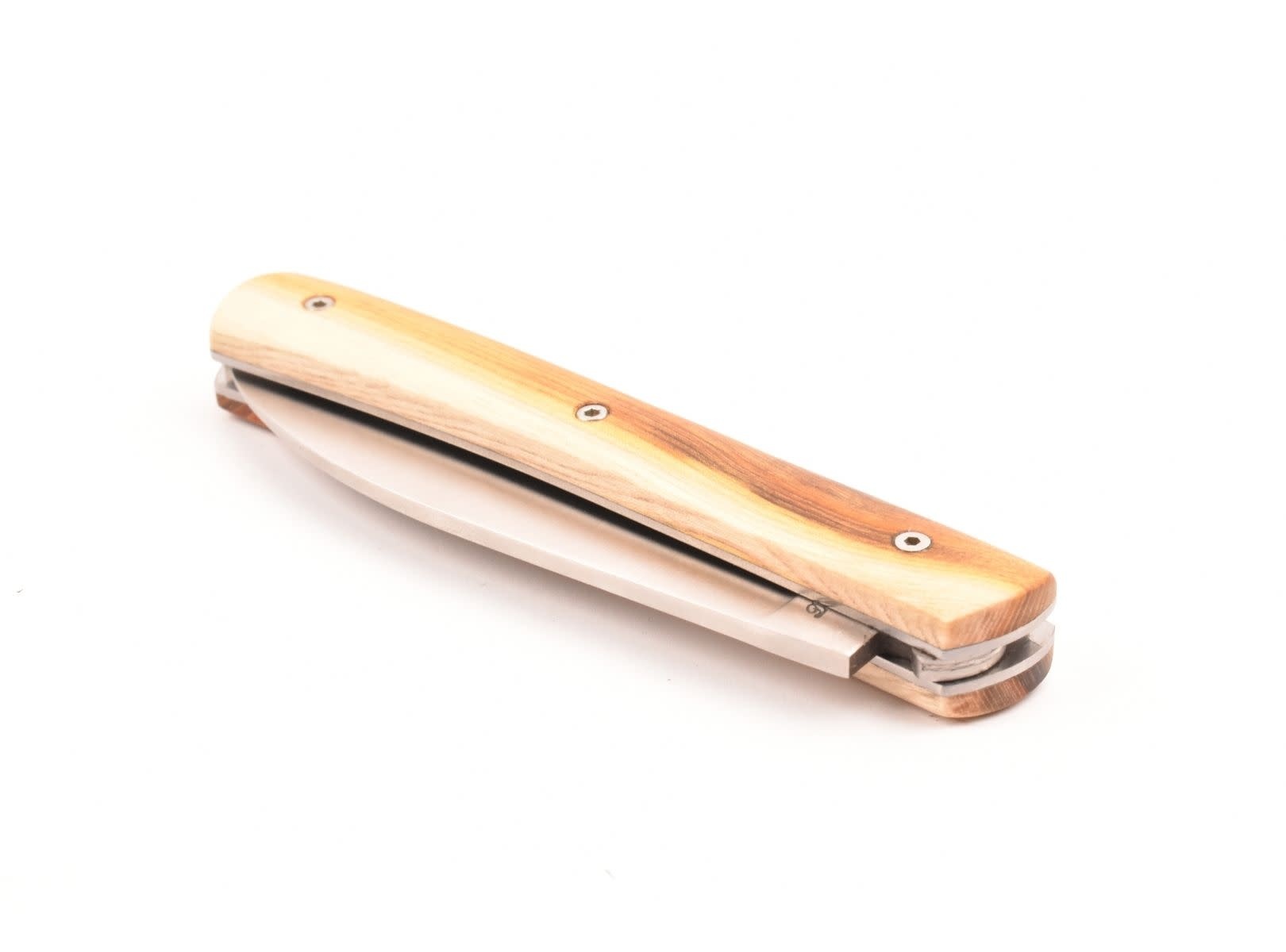 De zuivere, lange lijn van dit TMC zakmes nodigt ons uit tot een zen-gevoel! De handgreep van het zakmes is gemaakt uit pistache. De schroefgrepen geven het product een zeer mooie uitstraling. De met de hand vervaardigde, versierde rug op de achterkant is discreet en elegant.