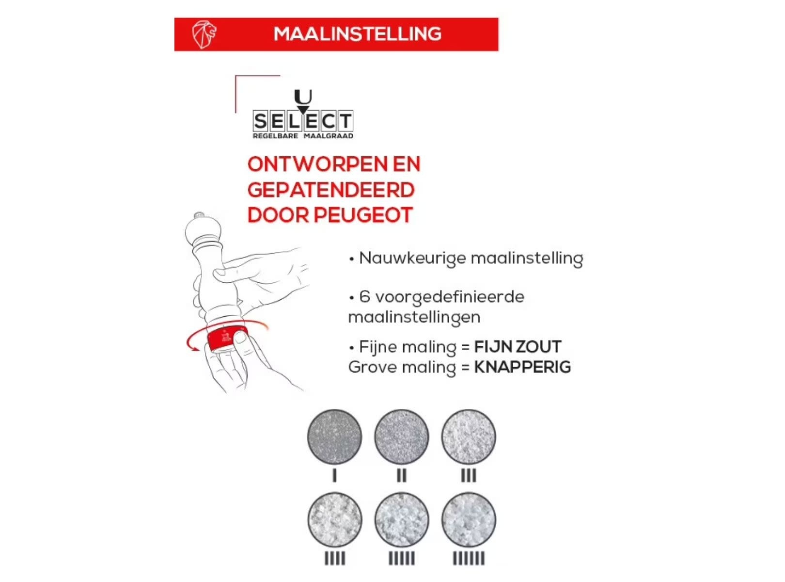 Deze zoutmolen is gemaakt van beukenhout uit duurzaam beheerde Franse bossen en geschikt voor droge zoutkristallen. Dankzij het gepatenteerde u'Select-maalsysteem van Peugeot kan je zelf de maalgraad instellen en de korrelgrootte van het zout naar wens aanpassen.