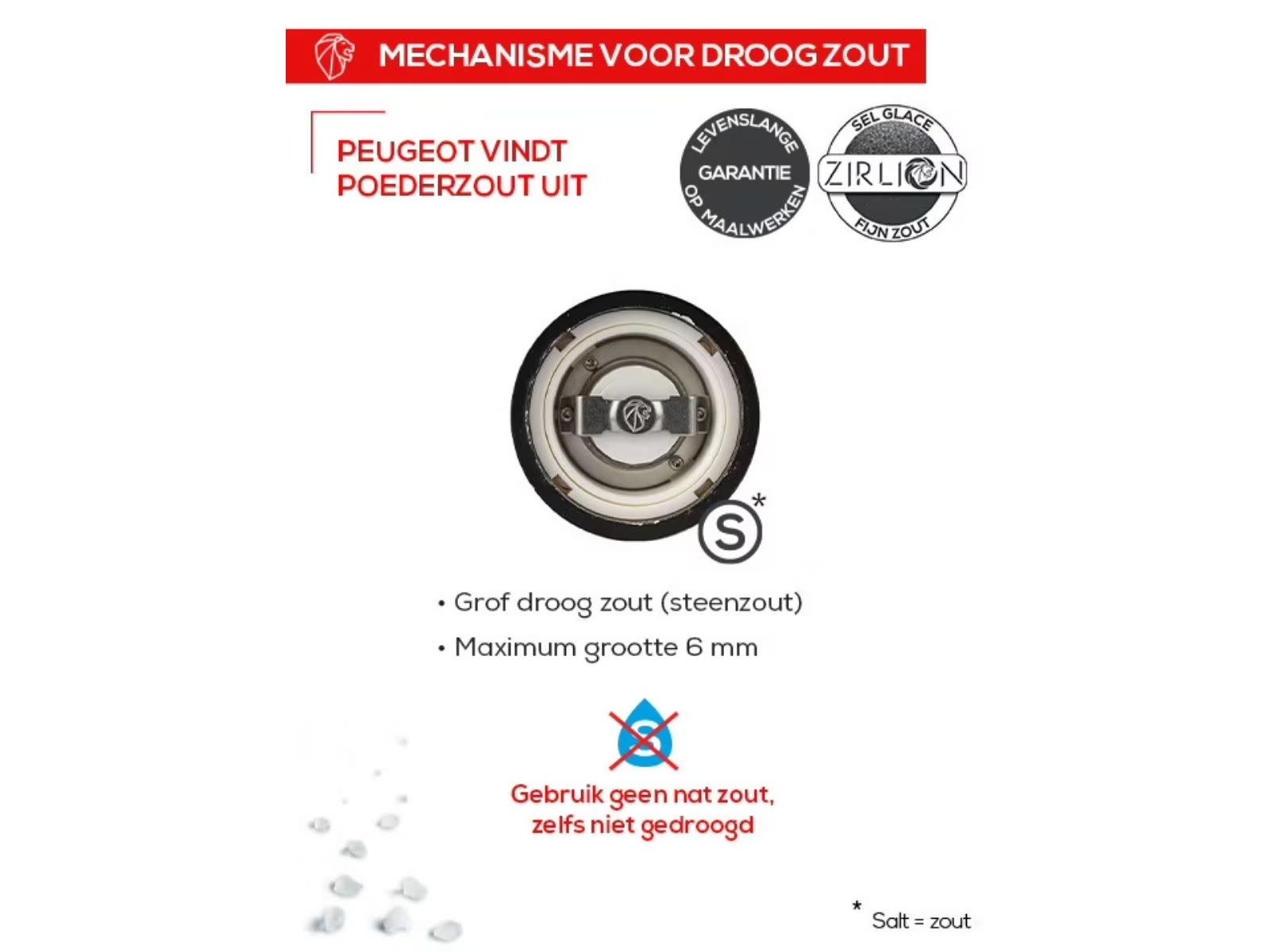 Het Zirconia mechanisme, een innovatie van Peugeot Research and Development, levert extreem fijn keukenzout en biedt het smaakgenot van zout terwijl de gebruikte hoeveelheid beperkt blijft. Uitgerust met het exclusief u’Select-systeem van Peugeot, biedt hij 6 verschillende posities aan voor een instelbare maalgraad om zo de maalgraad van droog zout zo goed mogelijk te bepalen. Zoals bij alle Peugeot molens, heeft zijn Zirconia maalwerk een levenslange garantie.
